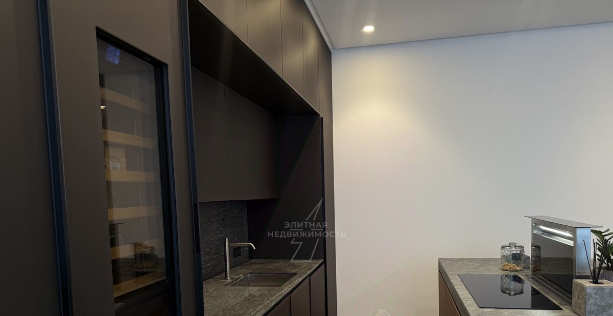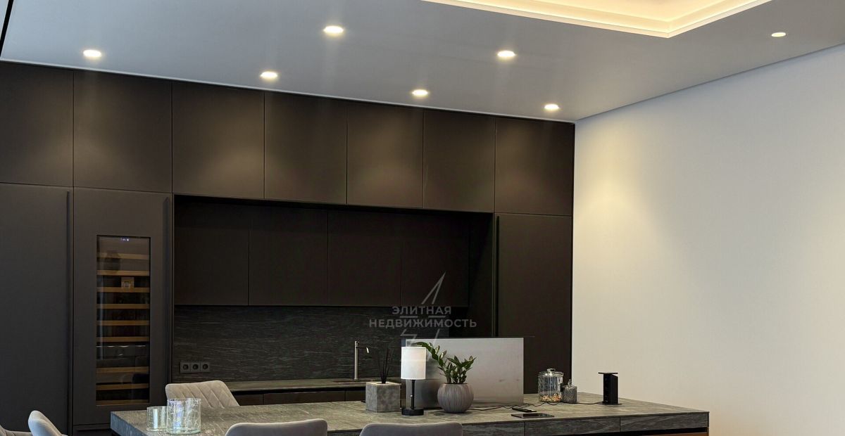 - Современная премиальная техника (холодильник, морозильник, духовой шкаф, посудомоечная машина, микроволновая печь, вытяжка с управлением, винный шкаф, кухонный остров с местами для хранения)