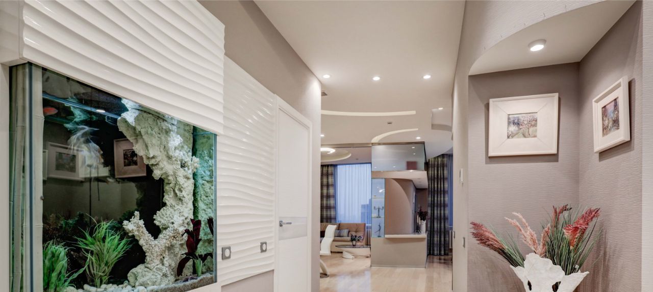 Особую атмосферу и изюминку в дизайне квартиры придает аквариум, который граничит с ванной (стена ванной-аквариум!) и просторным коридором. Зона отдыха ~60 кв м с большим комфортным диваном и TV (домашний кинотеатр); 3 изолированные спальные комнаты, одна их которых "мастер-спальня" со своим санузлом (ванна+душевая+ сауна).