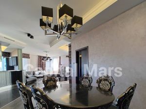 Пространство оформлено в современном стиле с применением натуральных материалов, квартира меблирована и оснащена качественной бытовой техникой.