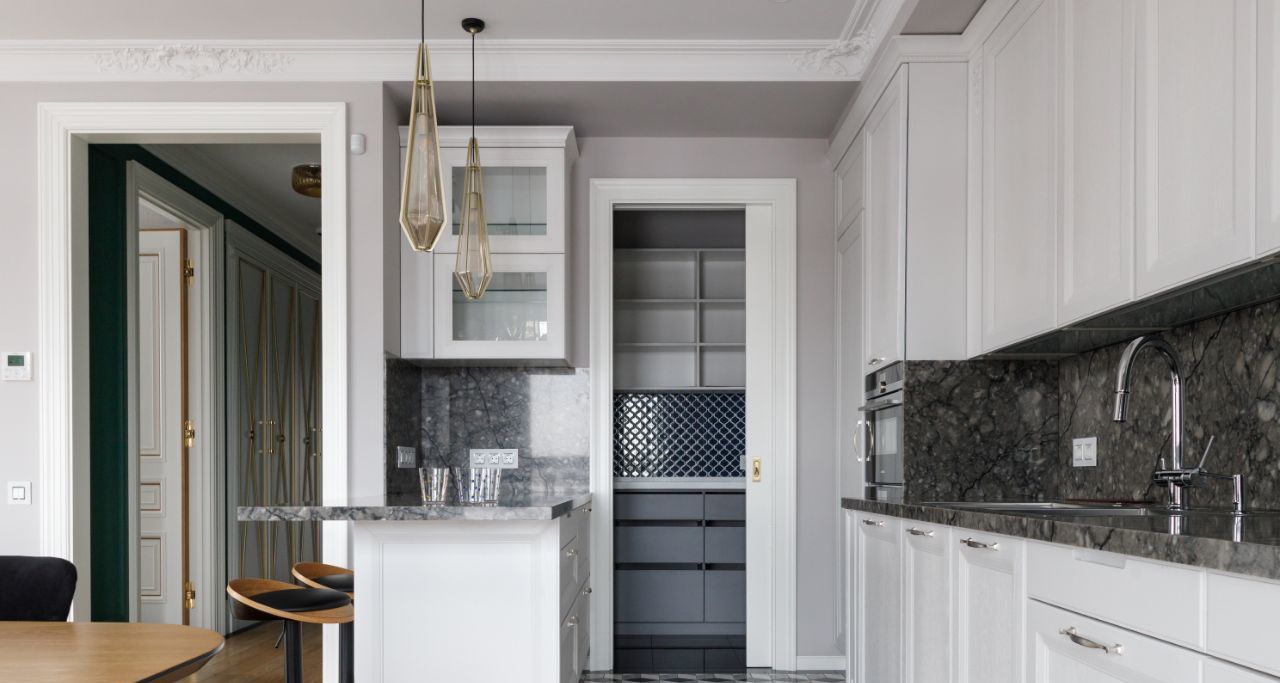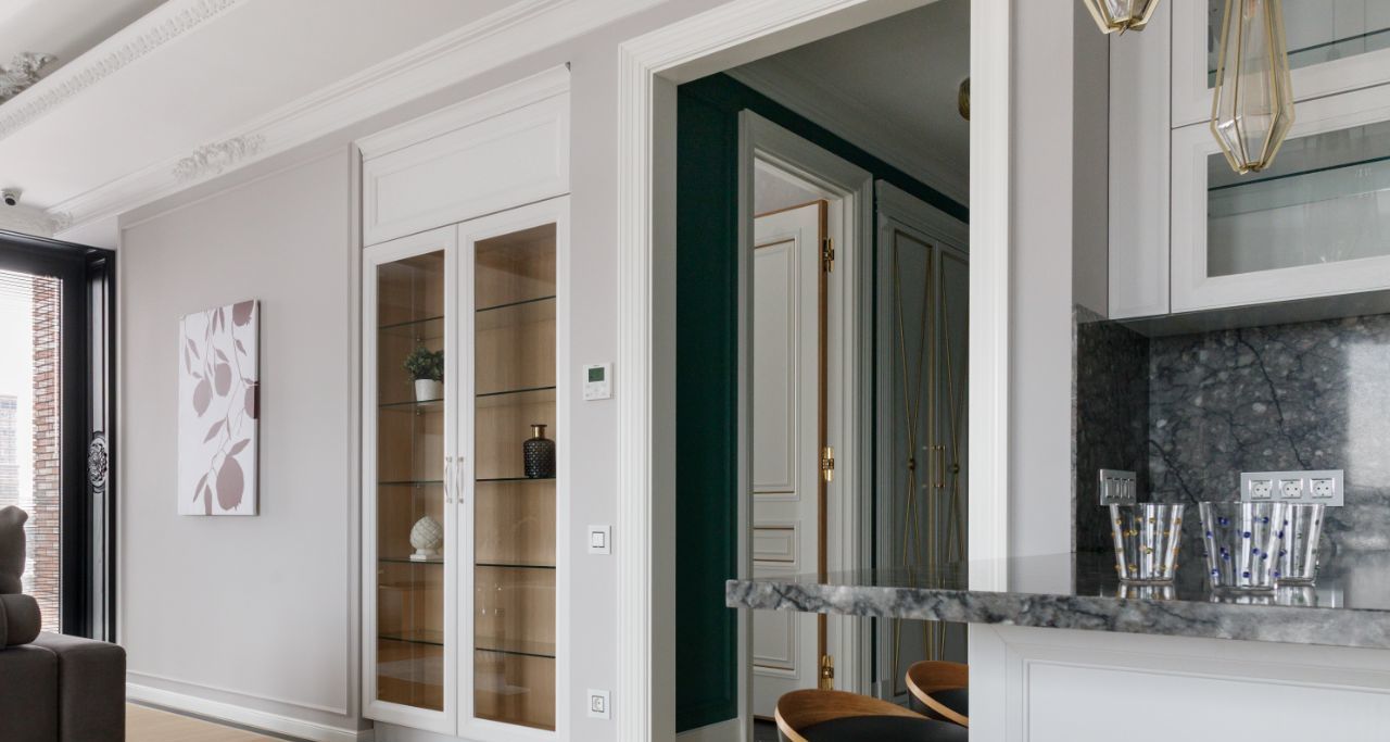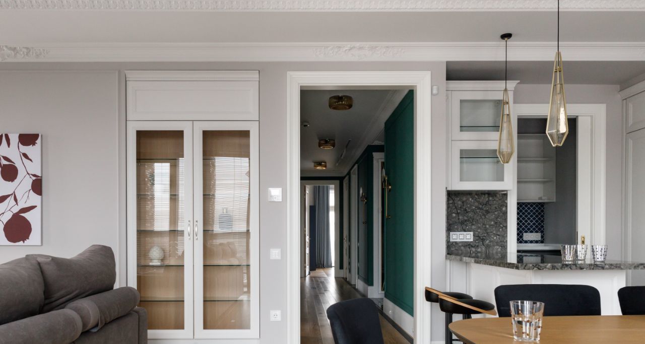В квартире есть гостиная совмещенная с кухней , кухня оборудована всей необходимой техникой ( плита, вытяжка, микроволновая печь, духовка с пароваркой, 2 холодильника, стоят фильтры для воды) , есть кладовое помещение