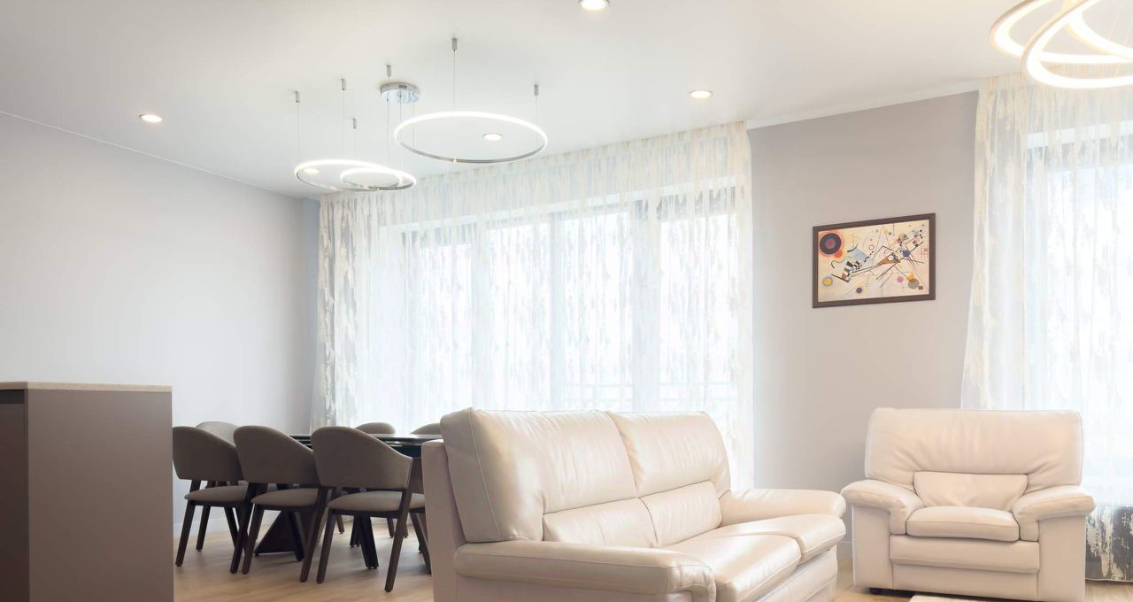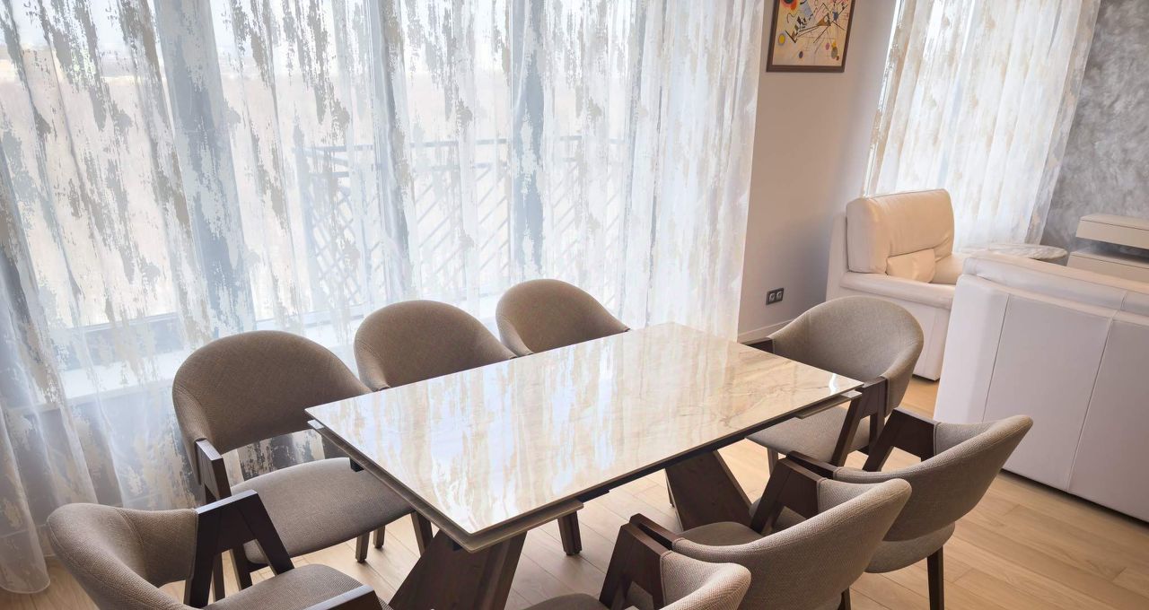 Потолки высотой 3 метра дарят ощущение свободы и объема, а панорамные окна открывают живописный вид на зелень и город.