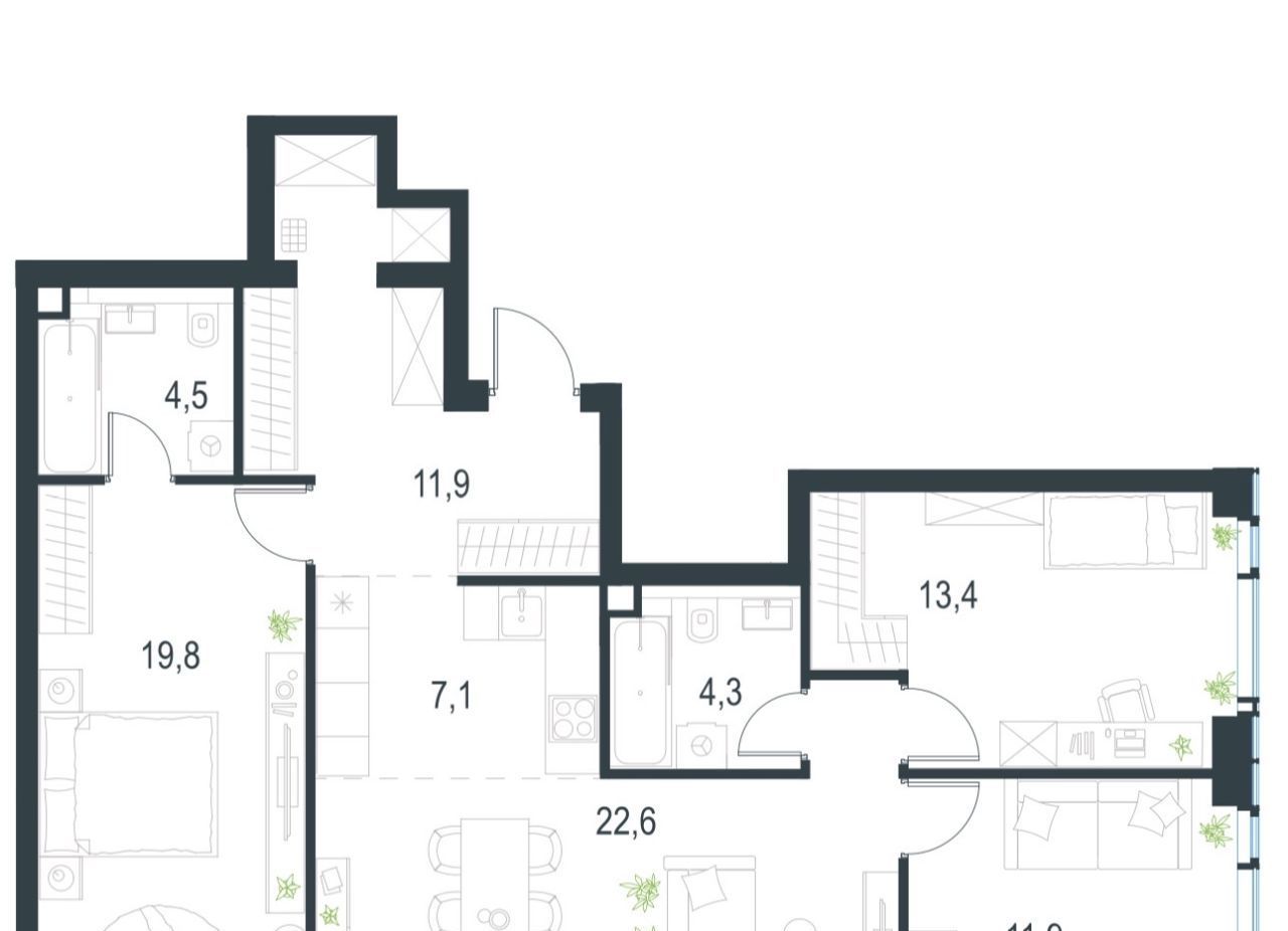 В квартире 4 комнаты, что позволяет спланировать три спальни и кухню-гостиную. Также предусмотрены две ванные комнаты. Квартира сдаётся без отделки, возведены стены - white box - у вас есть уникальная возможность воплотить в жизнь собственные дизайнерские решения!