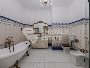 Квартира оформлена в классическом стиле с использованием натурального мрамора и высококачественных деревянных материалов. Полы выполнены в оригинальном рисунке Французская ёлочка, а стены украшены изысканной лепниной и картинами.