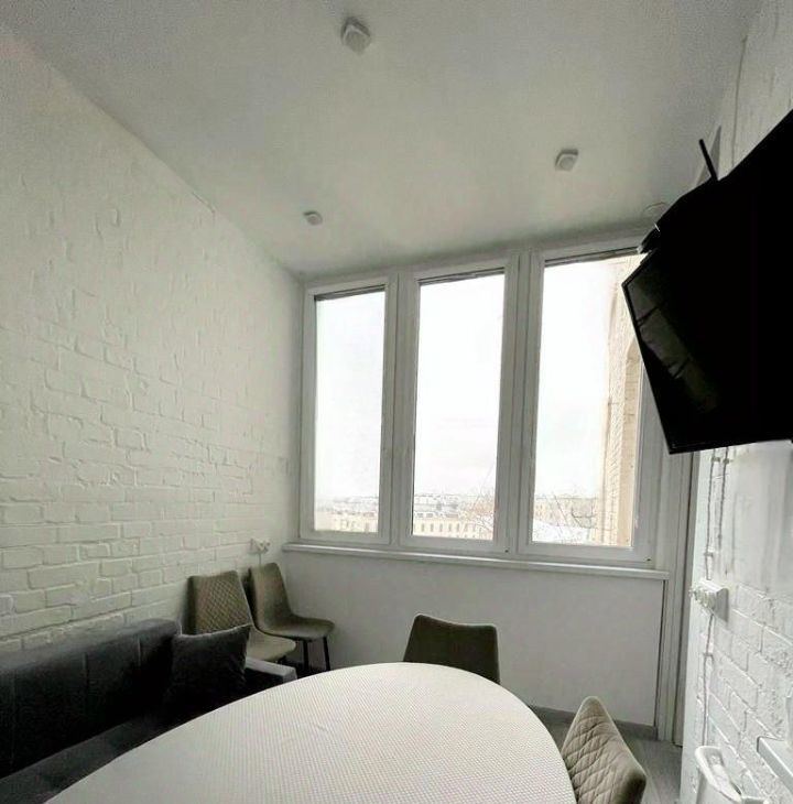 Кухня выходит на утеплённую лоджию, где организована уютная столовая зона с диванчиком, телевизором и овальным обе