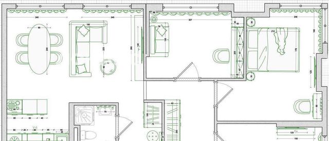 Просторная гостиная с кухней и 3 изолированные спальни. 2 совмещённых санузла.