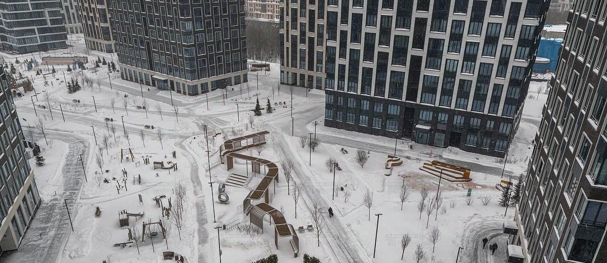Территория комплекса оформлена как большой парк с зонами отдыха, детскими площадками и прогулочным бульваром.