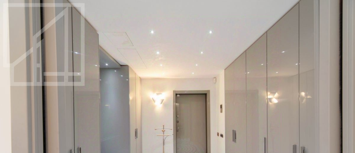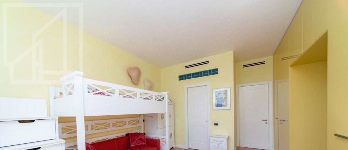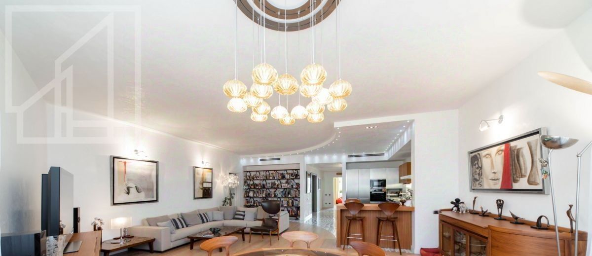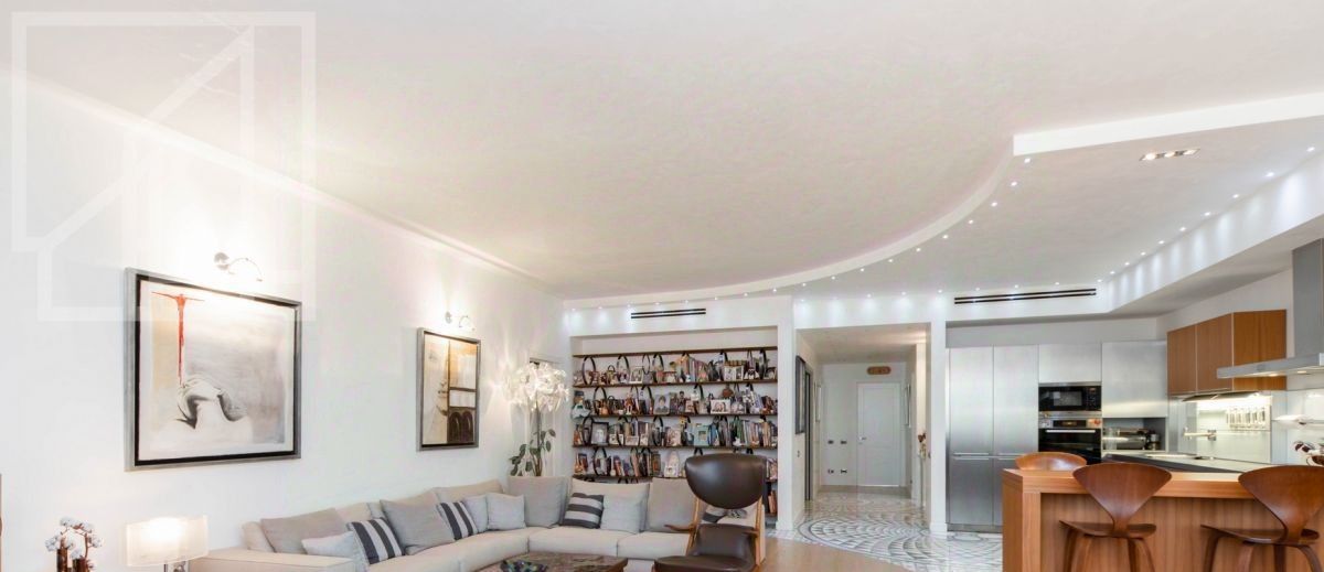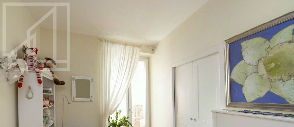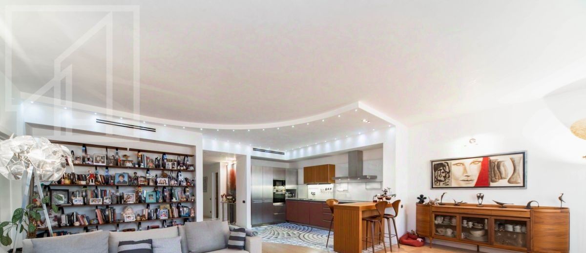 Планировка: гостиная-кухня, основная спальня с двумя гардеробными и ванной комнатой, детская со своей ванной комнатой, комната свободного назначения, гостевой туалет, балкон. Панорамные виды на город. Квартира с эксклюзивной итальянской мебелью, дорогостоящими отделочными материалами, в ванных комнатах мозаика Sicis.