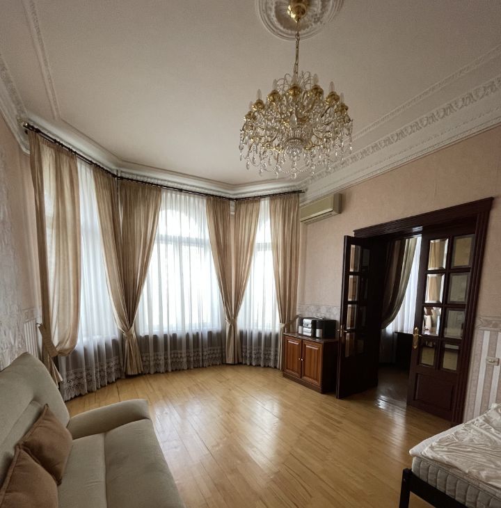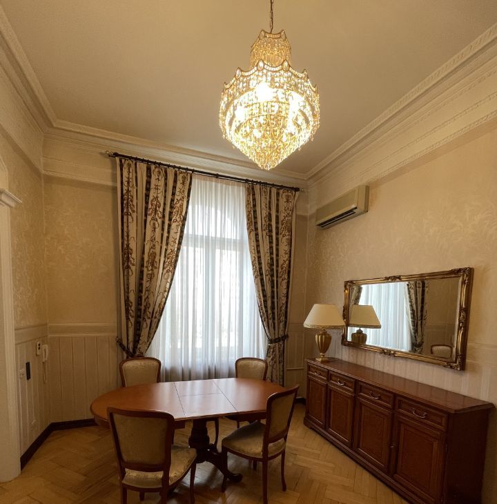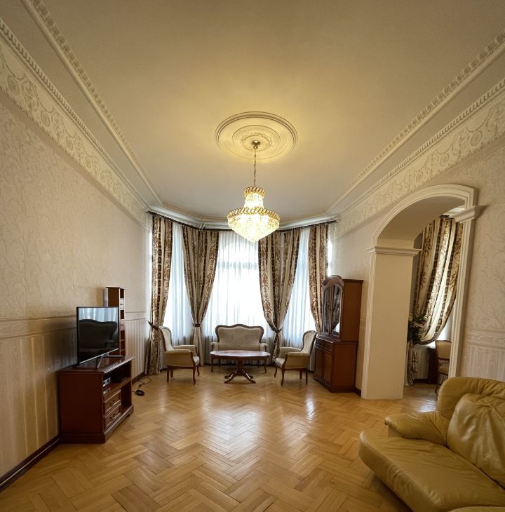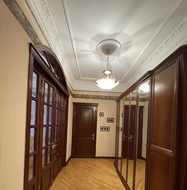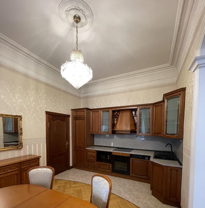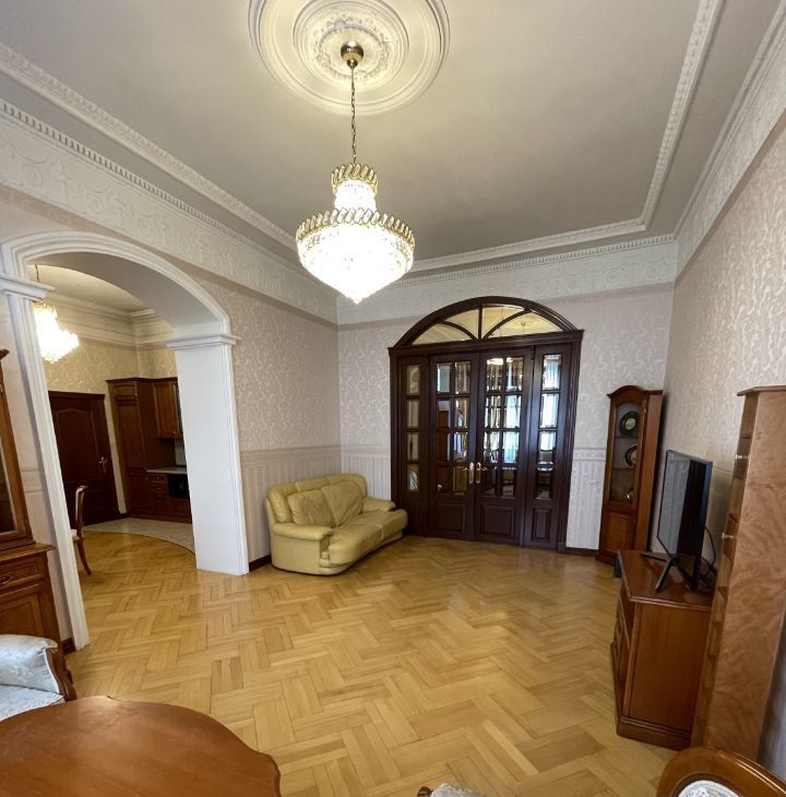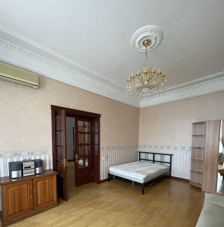 Сдаётся просторная четырёхкомнатная квартира в кирпичном доме 1949 года постройки, расположенная на 4 этаже из 8. Общая площадь — 150 кв. м, жилая площадь — 125 кв. м, кухня — 20 кв. м. Высокие потолки 4 метра создают ощущение простора. Всего в квартире два совмещённых санузла, окна выходят на улицу. До станции метро "Маяковская" всего 3 минуты пешком.