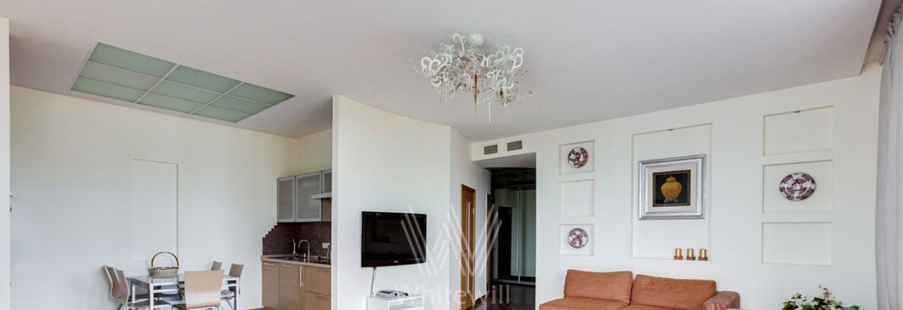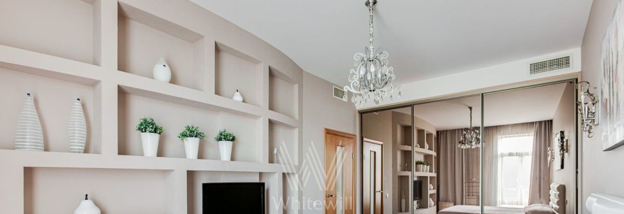 Планировка: кухня-гостиная с обеденной зоной на 5 человек, 2 спальни, кабинет, в котором можно организовать дополнительную спальню, 2 санузла — один с ванной, второй — с дешевой кабиной, холл. Квартира оснащена всей необходимой мебелью и техникой. Предусмотрено много мест для хранения. Для автовладельцев предусмотрено машиноместо во дворе дома.