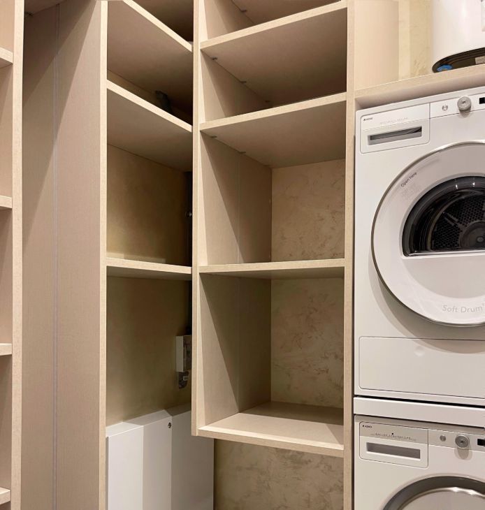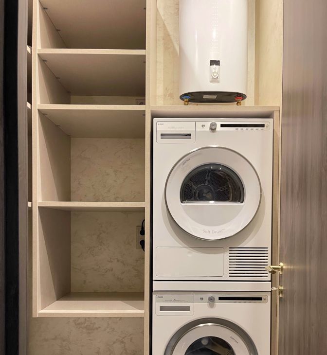 Бытoвая тeхника: встроенные духовой шкаф и микроволновая печь, варочная панель, посудомоечная машина, вытяжка, встроенный холодильник, стиральная и сушильная машины, бойлер. Система кондиционионирования во всех помещениях, а также теплые полы.