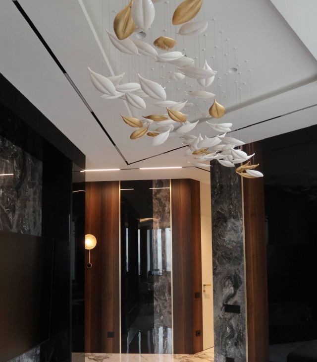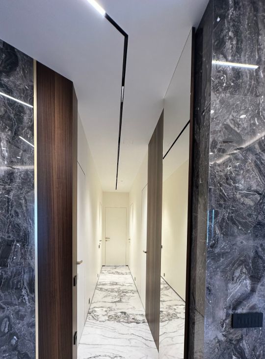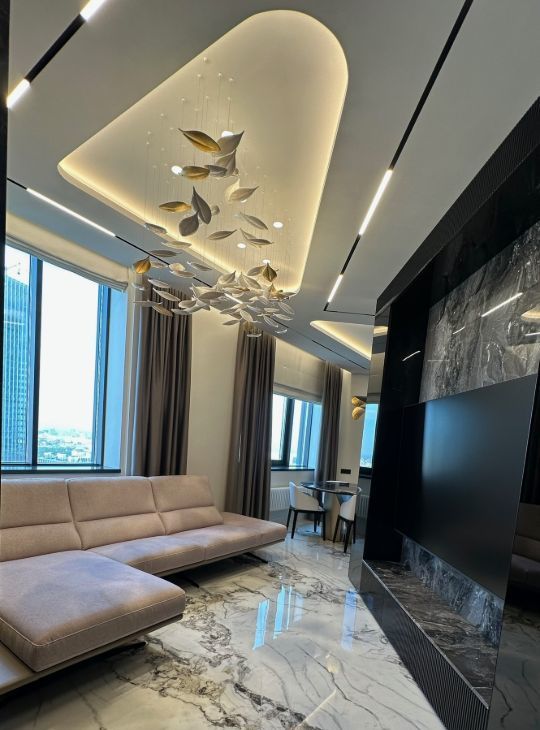 Квартира обладает функциональной и продуманной планировкой, а воплощенный дизайн с использованием натуральных материалов ( мрамор, гранит, шпон эвкалипта) создает ощущения комфортной и уютной атмосферы для всей семьи!
