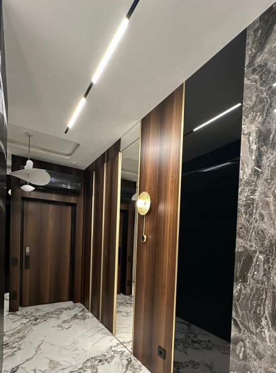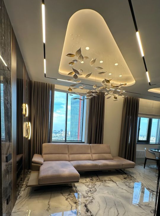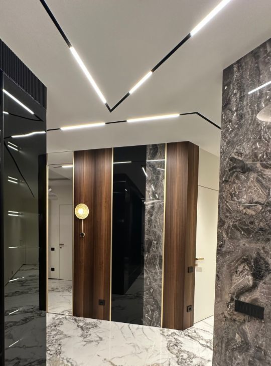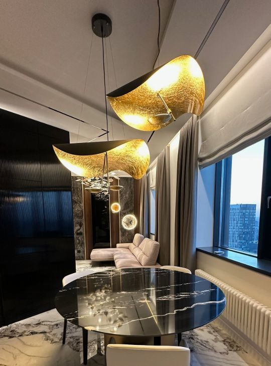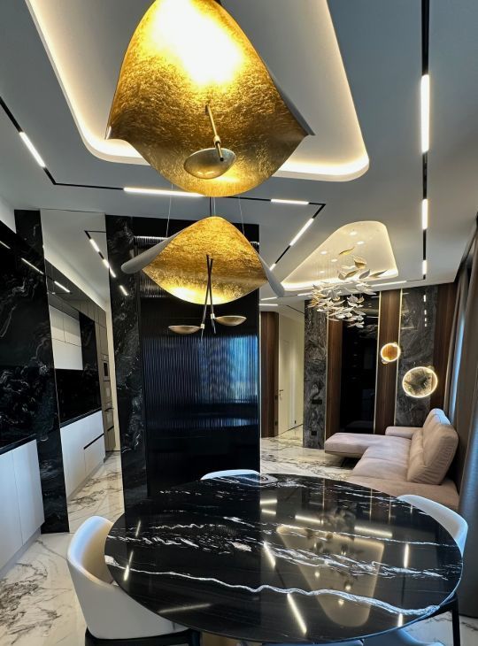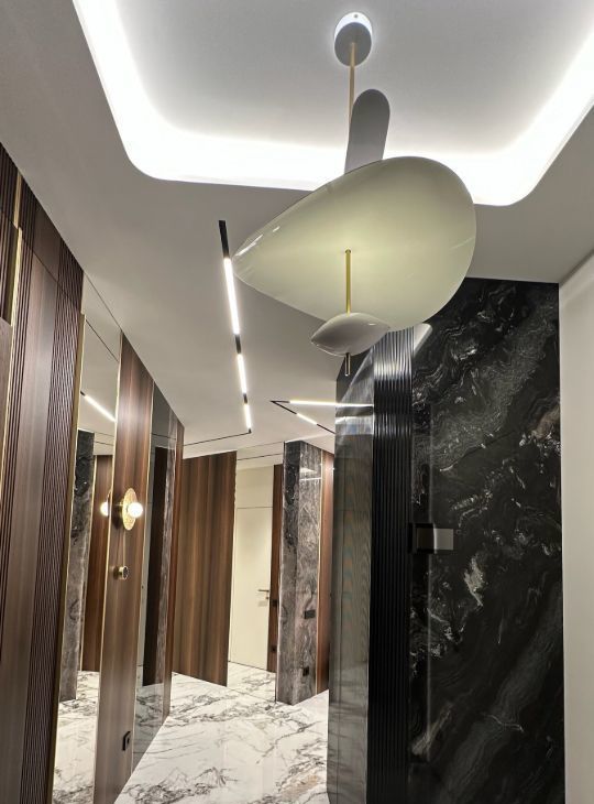 Квартира обладает функциональной и продуманной планировкой, а воплощенный дизайн с использованием натуральных материалов ( мрамор, гранит, шпон эвкалипта) создает ощущения комфортной и уютной атмосферы для всей семьи!
