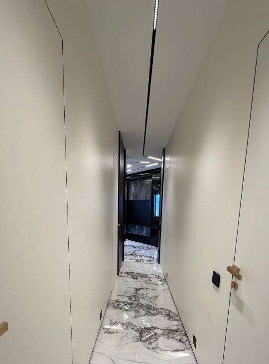 Квартира оборудована электроприводами на шторы, теплыми полами и кондиционированием. Оборудовано премиальной встроенной техникой, в отделке использованы качественные, дорогие материалы — интерьер выглядит статусно и актуально.