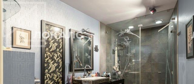 Функциональная планировка включает гостиную с высокими потолками (6 м), объединенную с кухней, спальню с ванной комнатой на первом уровне; на втором уровне - комнату отдыха в китайском стиле со старинными восточными литографиями и кабинет (может использоваться как вторая спальня) с ванной комнатой. Квартира с эксклюзивной отделкой, прекрасным деревянным полом из ореха, натуральными кирпичными стенами и действующими каминами.