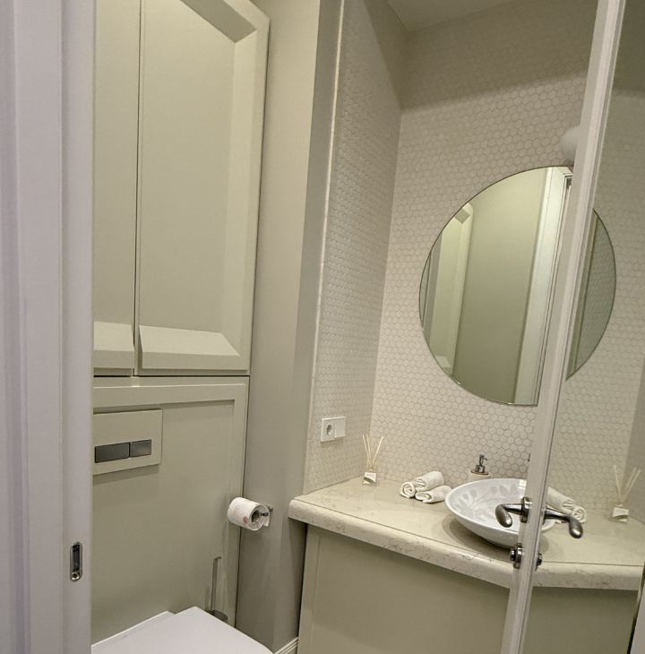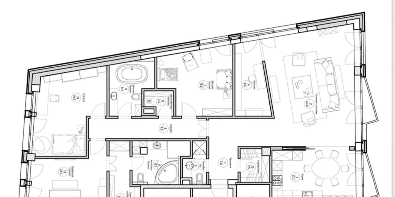 2 спальни с ванной комнатой, кабинет, просторная гостиная, отдельная кухня, гостевой санузел, гардеробная при входе , прстирочно- хозяйственная комната .