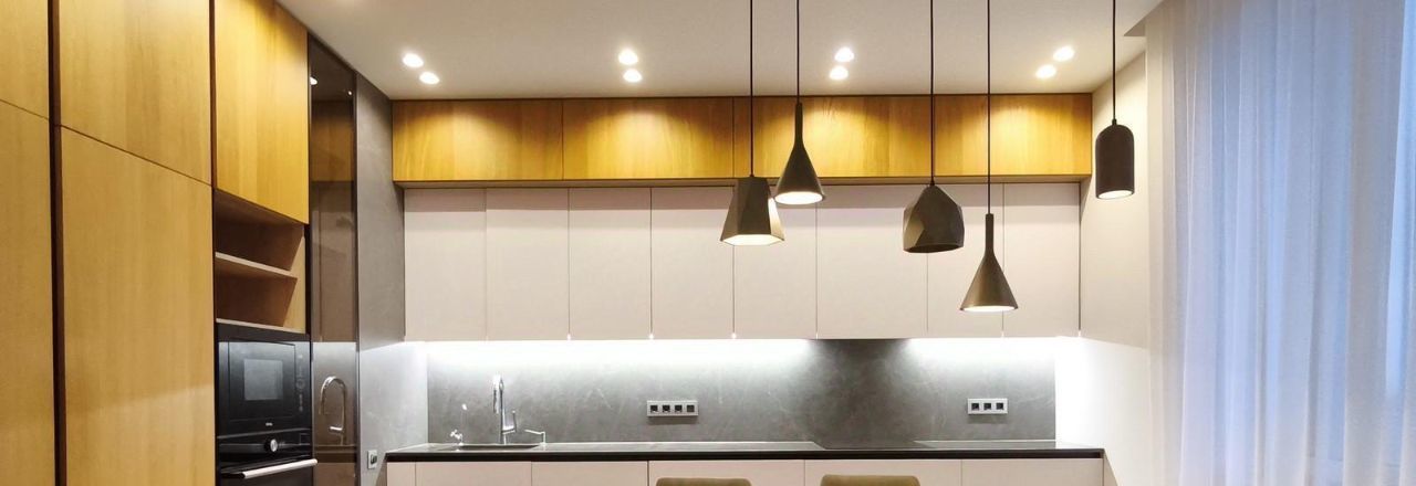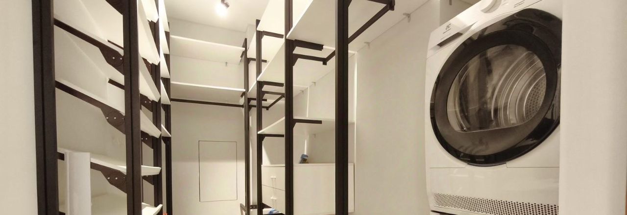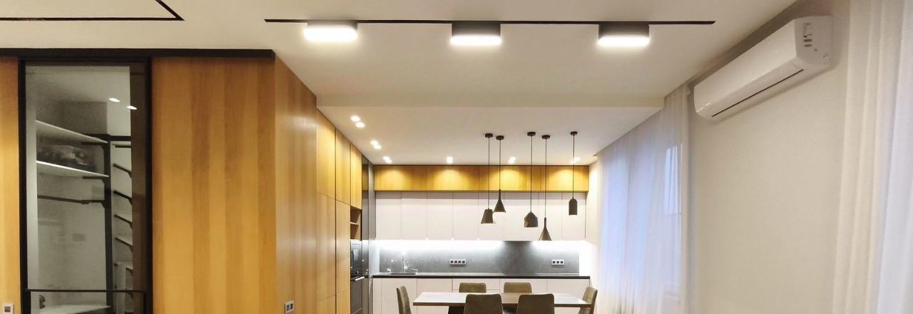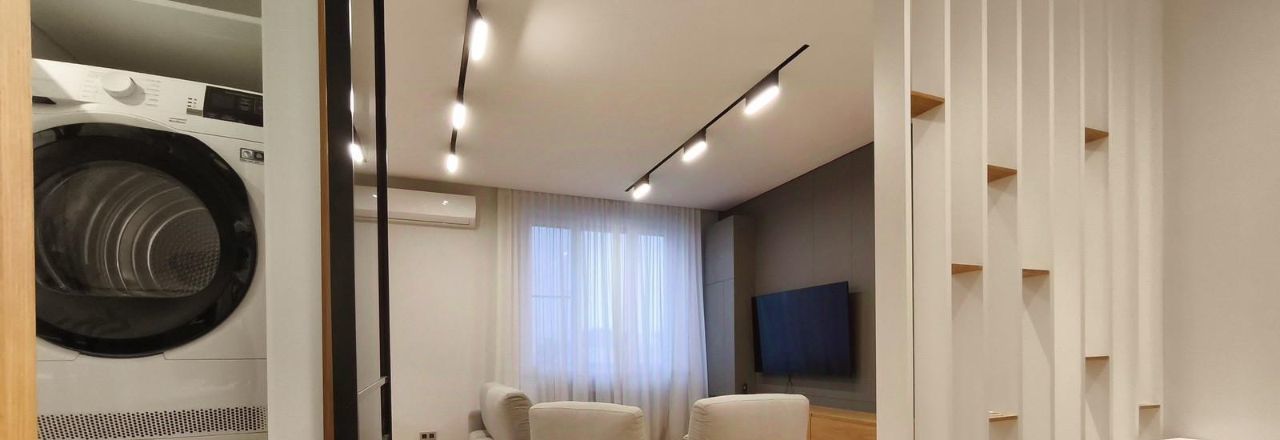 В гостиной диван, большой ТВ, обеденный стол. Кухонный гарнитур с духовкой, посудомоечной, вместительным холодильником. Из прихожей налево через затемненную стеклянную дверь проход в огромную гардеробную.
