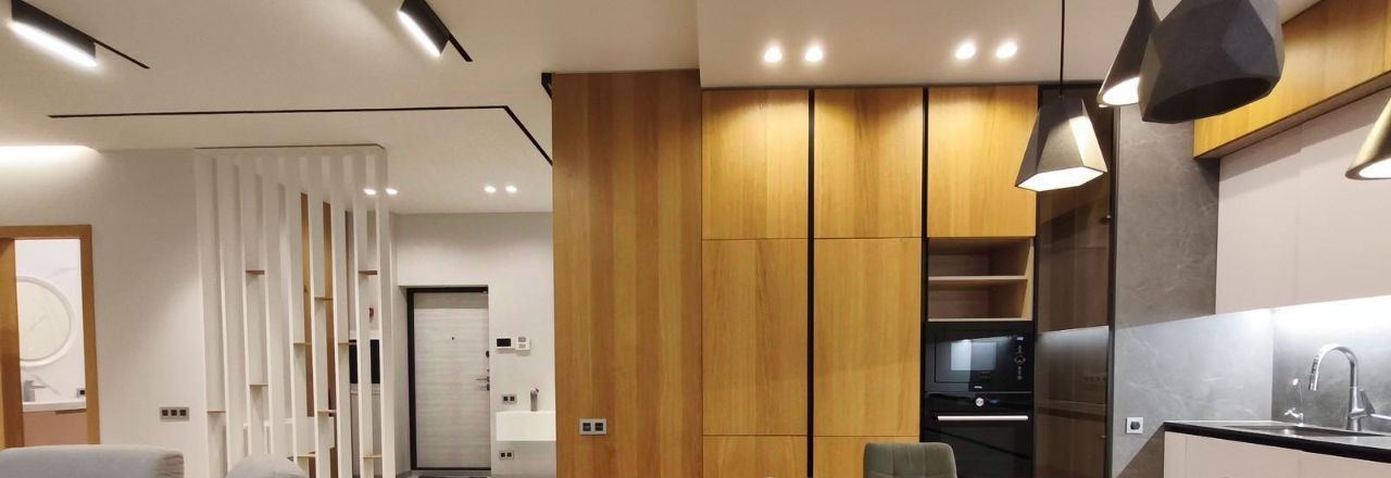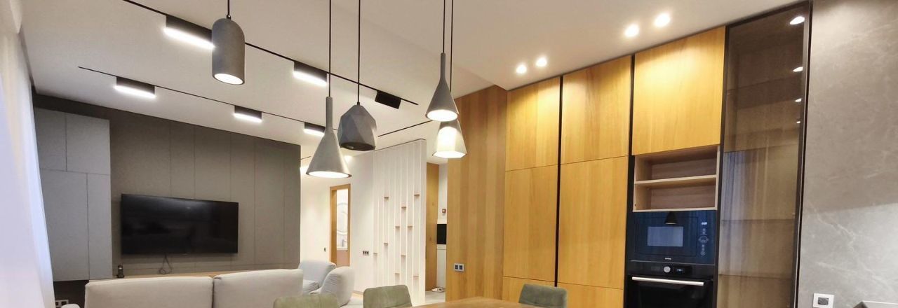 Объединенная кухня-гостиная, три спальни и два санузла, отдельная гардеробная комната.