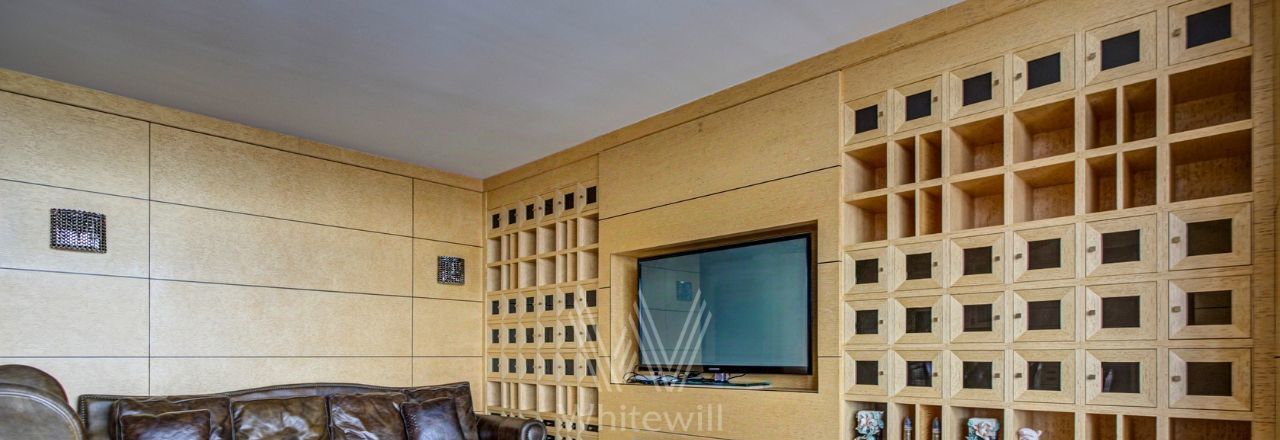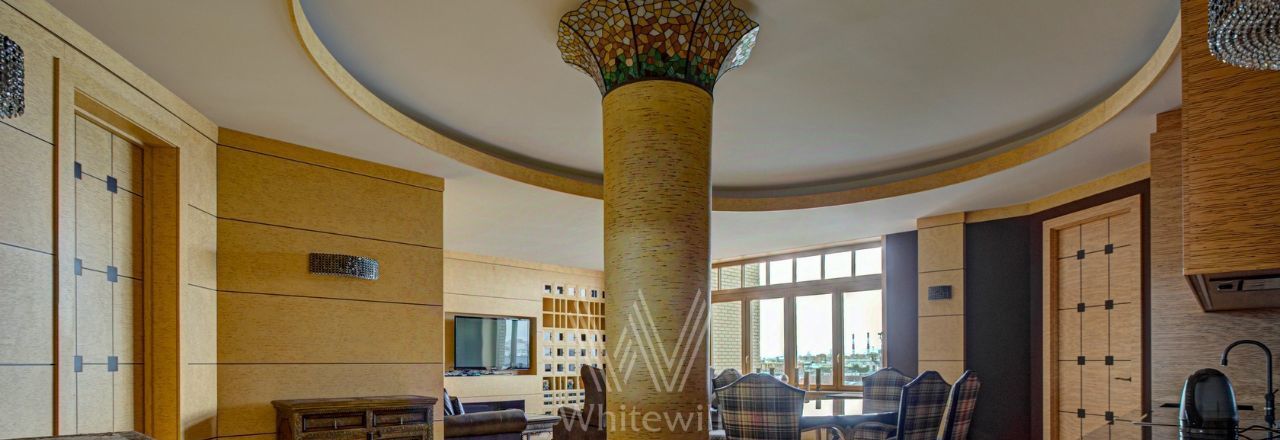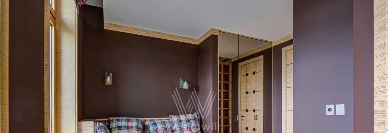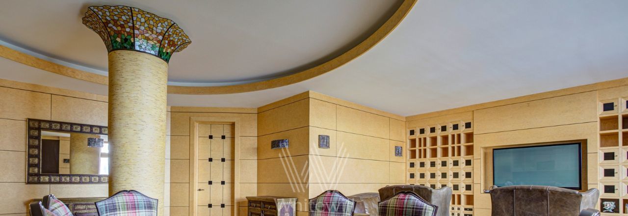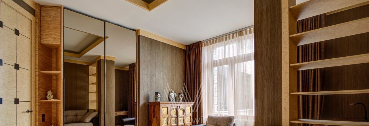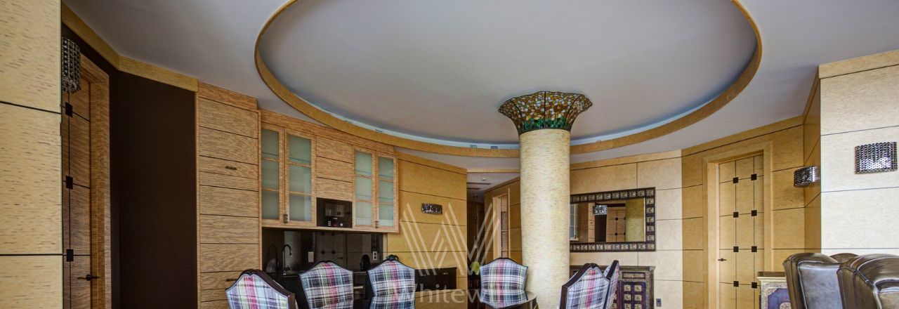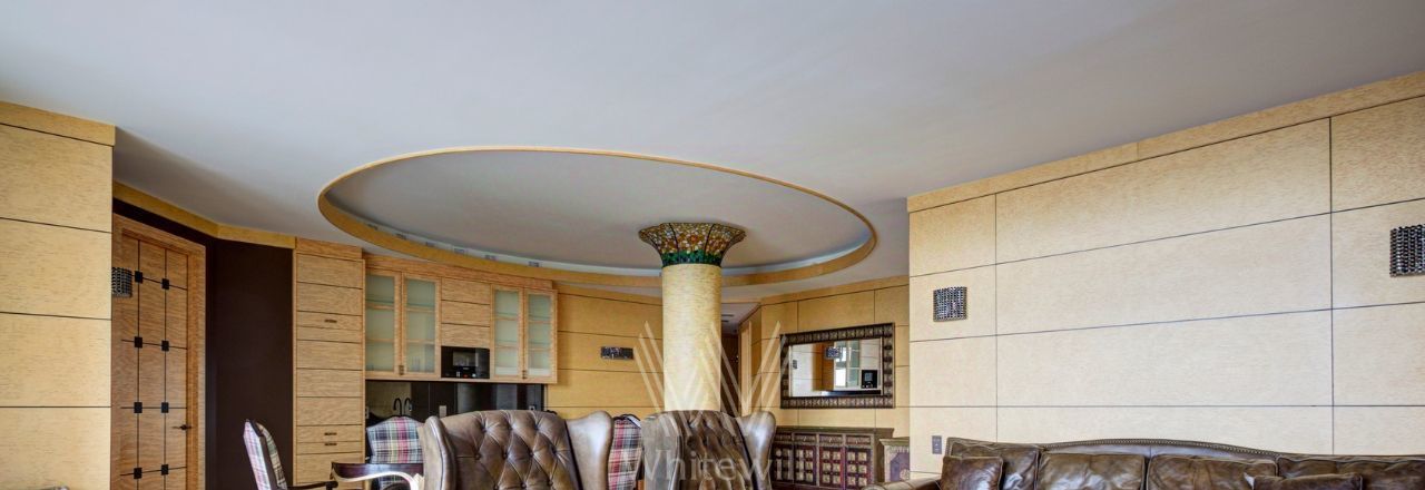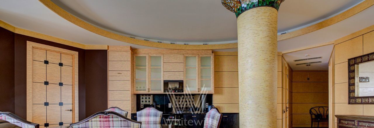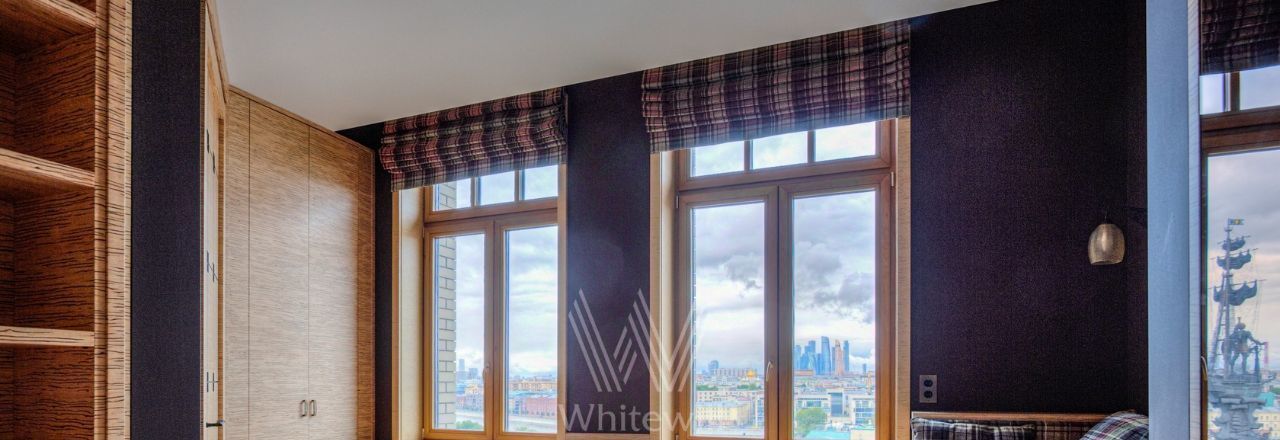 Видовая квартира в комплексе "Коперник" с панорамными видами на Храм Христа Спасителя, памятник Петру I. Квартира площадью 152 м² расположена на 9 этаже. Внутри выполнена дизайнерская отделка с использованием натурального дерева и камня. Интерьер выдержан в оттенках шоколадно-коричневого и цвета слоновой кости. В гостиной круглая колонна с мозаичной капителью. Установлена антикварная мебель, брендовая бытовая техника, сантехника премиум-класса. Предусмотрена система климат-контроля.