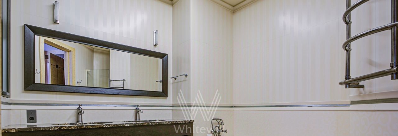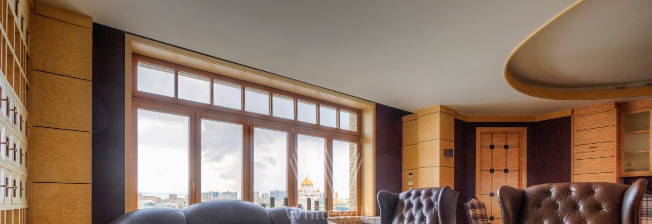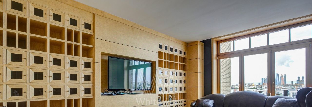 Планировка: холл, просторная гостиная с обеденной зоной, основная спальня с двумя гардеробными и ванной комнатой, вторая спальня с собственной ванной комнатой, кабинет, гостевой санузел. Кабинет можно использовать как третью спальню. Из панорамных окон открываются виды на Москву-реку, памятник Петру I, башни "Москва-сити", здание МИД, Храм Христа Спасителя. За квартирой закреплено машиноместо.