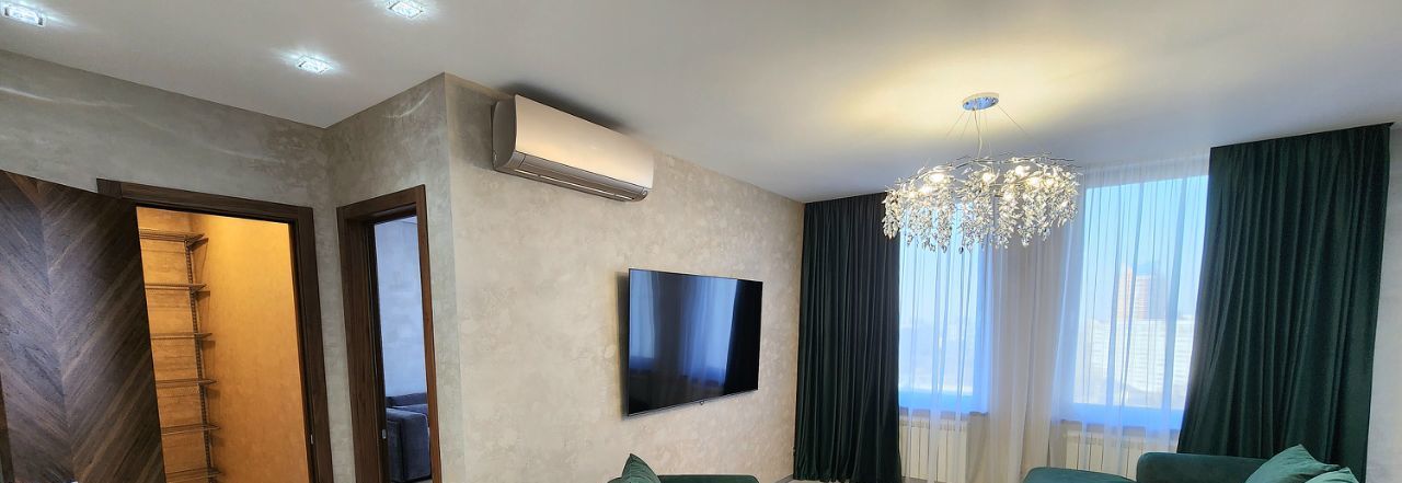 Кондиционеры в каждой комнате и в кухне/гостиной. Две большие лоджии. Квартира с планировкой на 2 стороны. Очень тихо, ремонты давно все завершены.