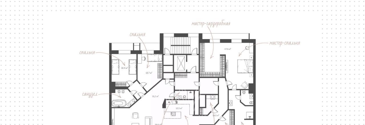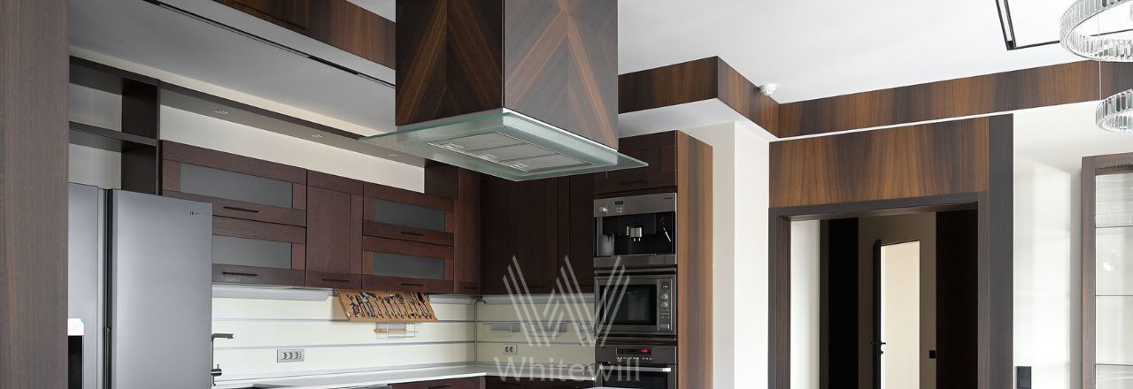 Планировка: гостиная с уютной каминной зоной, кухня-столовая, мастер-спальня с большой гардеробной, ванной комнатой с окном и выходом на балкон, блок из 2 детских спален с санузлом, кабинет, третий санузел с душем, гардеробная, постирочная, прихожая, холл. Квартира укомплектована мебелью и современной бытовой техникой. Из окон открываются виды в тихий благоустроенный двор и на улицу Гашека. Два машиноместа в подземном паркинге.