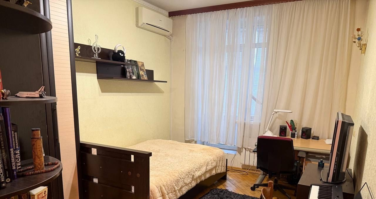 4 комната — жилая, может использоваться как Master Bedroom — 20,8 кв. м. Есть кондиционер, два гардеробных отдела, просторная кровать, дизайнерские полки. Окна на северную сторону.