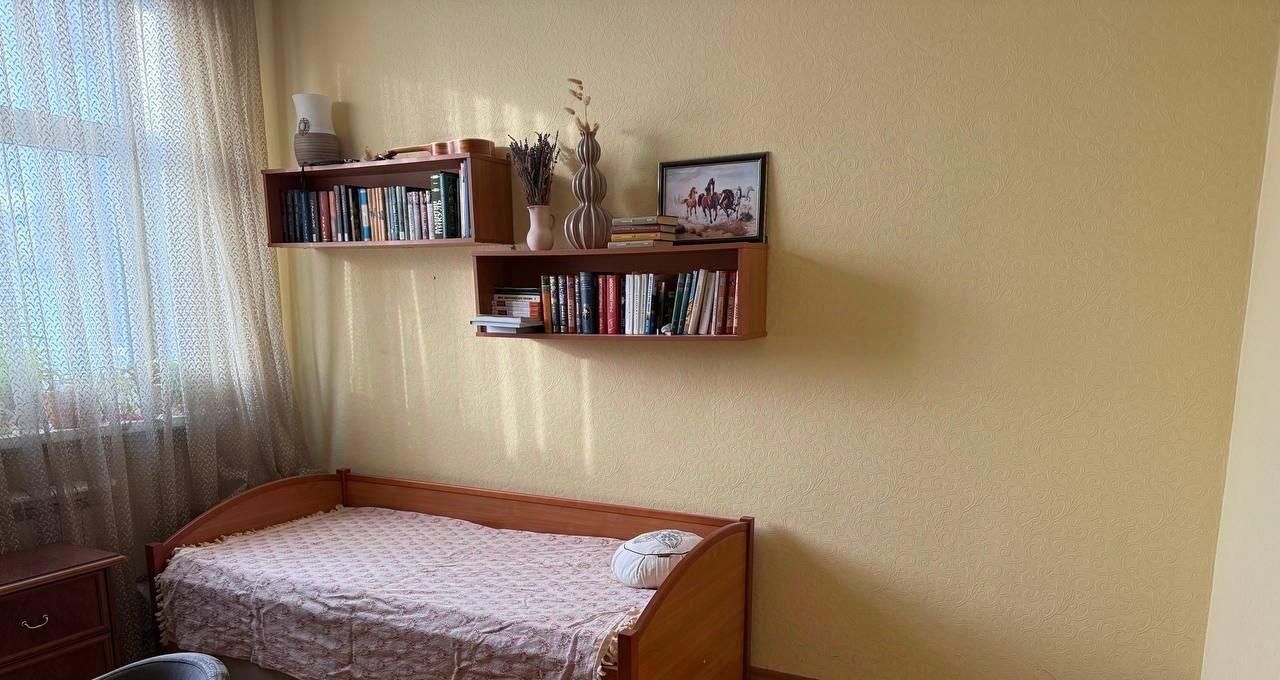 3 комната — Жилая, может выполнять роль детской или кабинета — 11,9 кв. м. Уютная комната с кроватью, рабочим столом и полками. Окна южные, выходят во двор, так что шума от дороги не слышно