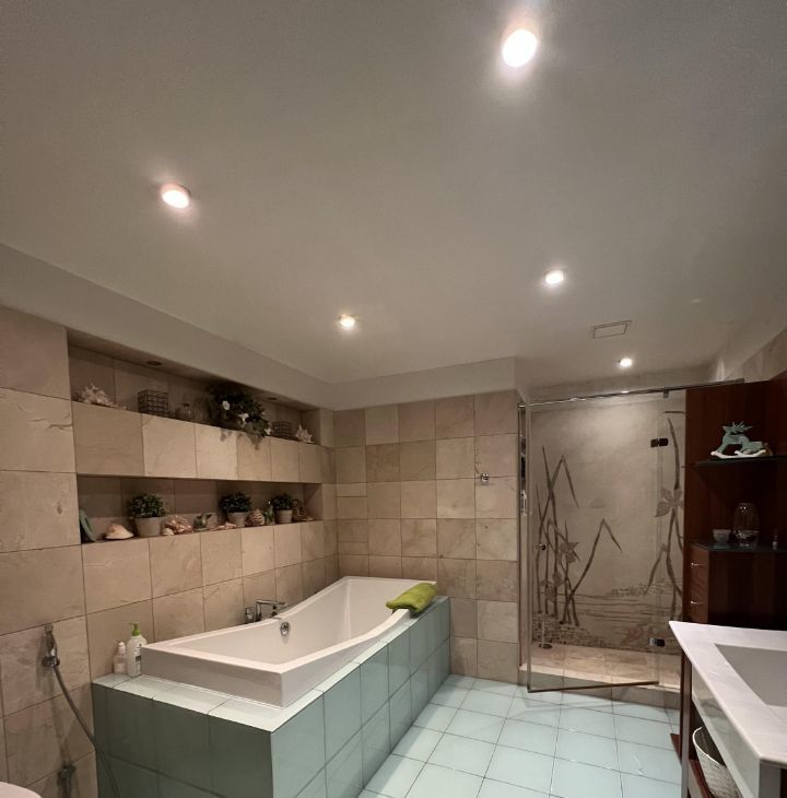 Просторная прихожая с гардеробной, два санузла, душевая кабина с сауной и отдельный хозблок с прачечной зоной.