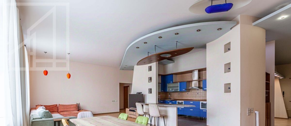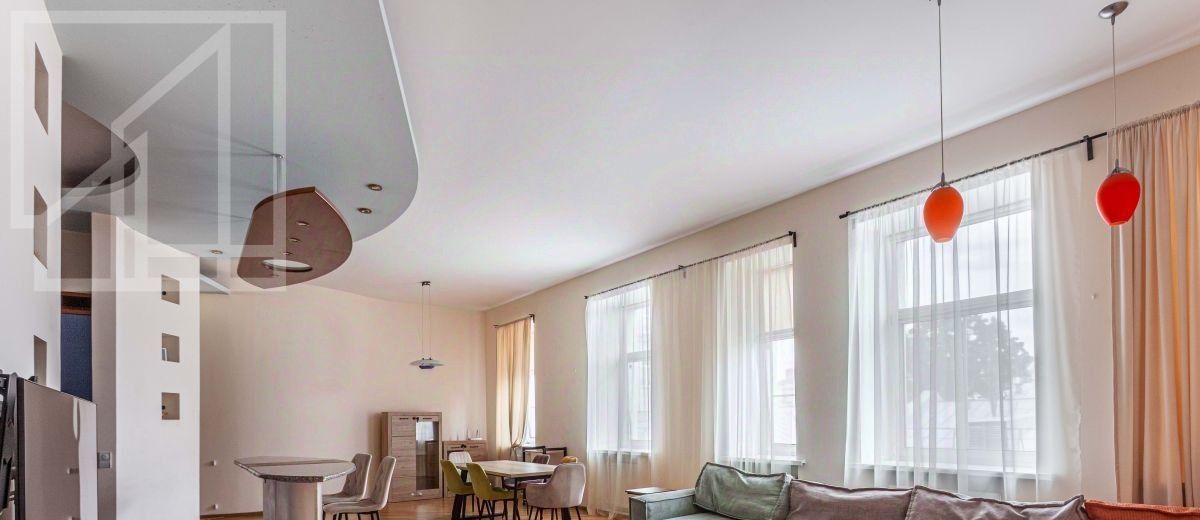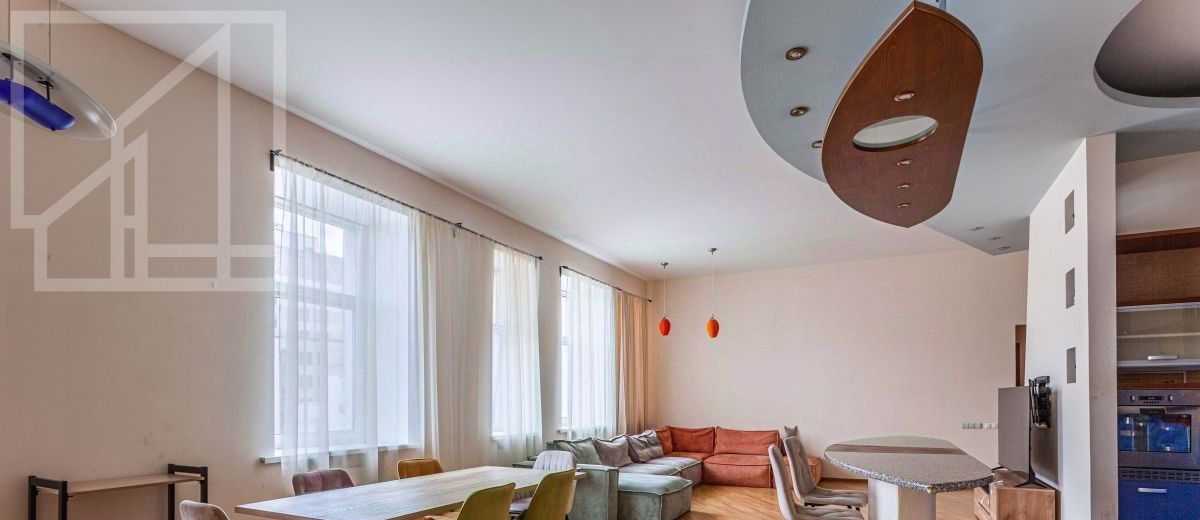 Планировка: гостиная, кухня, три отдельные спальни, два санузла (есть ванна и душевая кабина), постирочная. Потолки — 3,2 м. Выполнен качественный ремонт в стиле модерн.