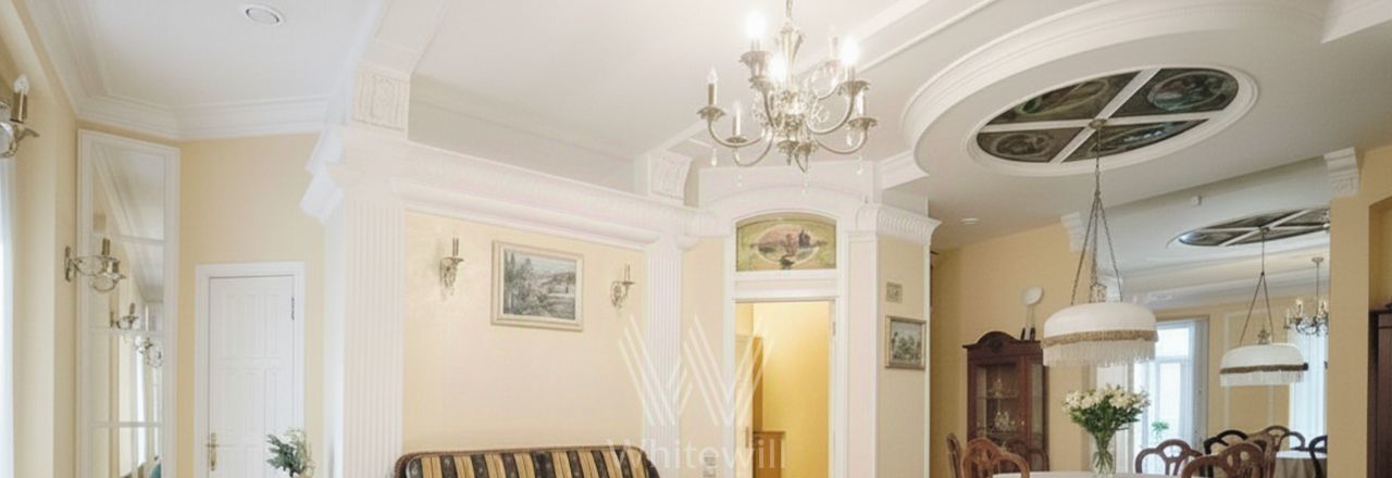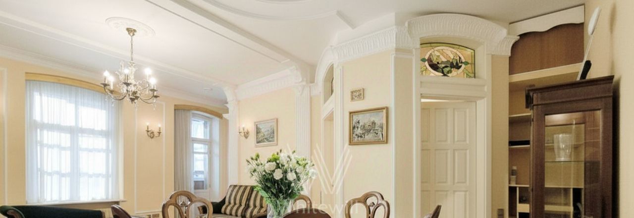 Просторная квартира с 3 спальнями площадью 100 м² в доме "Остоженка, 7" в Хамовниках. Интерьер оформлен в спокойных тонах, гостиная в классическом стиле украшена молдингами, многоуровневыми потолками, лепниной, эффектными люстрами и мебелью под винтаж. Комнаты укомплектованы всем необходимым для комфортного проживания. Планировка: кухня-гостиная, 3 спальни, 2 совмещенных санузла, постирочная, балкон. Окна выходят во двор. Машину можно оставить на огороженной территории.