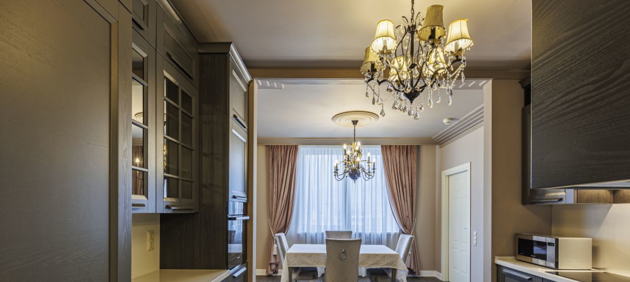 Интерьер выполнен в элегантной классике: много света, молдинги, качественная столярка, натуральный паркет, дизайнерские люстры.