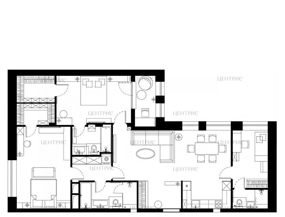 гостиную в едином пространстве с обеденной зоной и кухней. Три мастер спальни:
