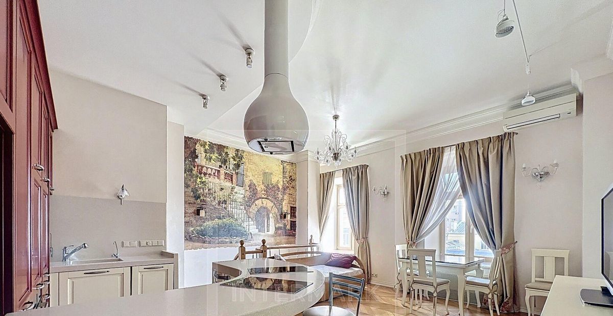 ID 29348. Стильная 2-х уровневая квартира в реконструированном доме в районе Кузнецкого Моста с подземным паркингом Общей площадью 135 кв.м. На первом уровне кухня - столовая, спальня с гардеробной и ванной комнатами, на втором уровне гостиная с домашним кинотеатром, спальня с гардеробной и ванной комнатами. К вашим услугам свежий ремонт с использованием натуральных материалов, авторский дизайн, мебель натурального дерева. В цену включено подземном паркинге.