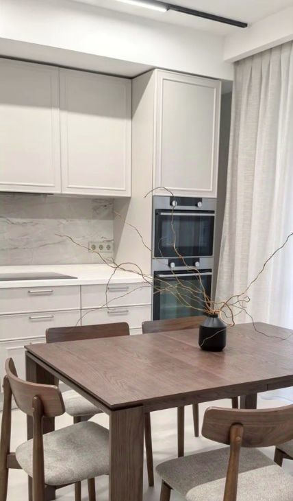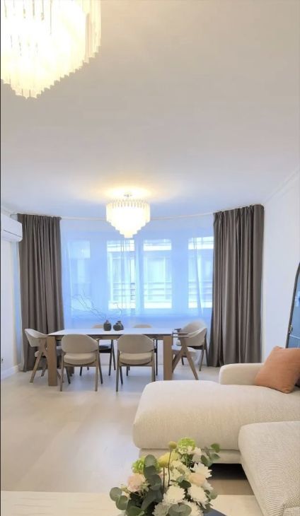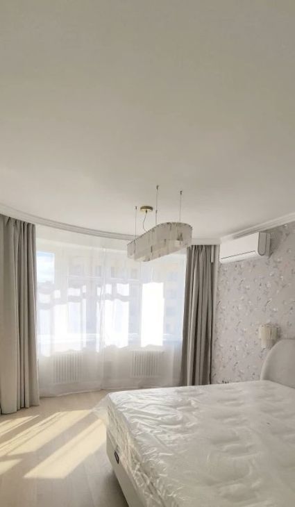 В квартире выполнен дизайнерский ремонт в спокойных тонах. Удобная планировка: 3 спальни, гостиная, кухня-столовая, гардеробная, два санузла.