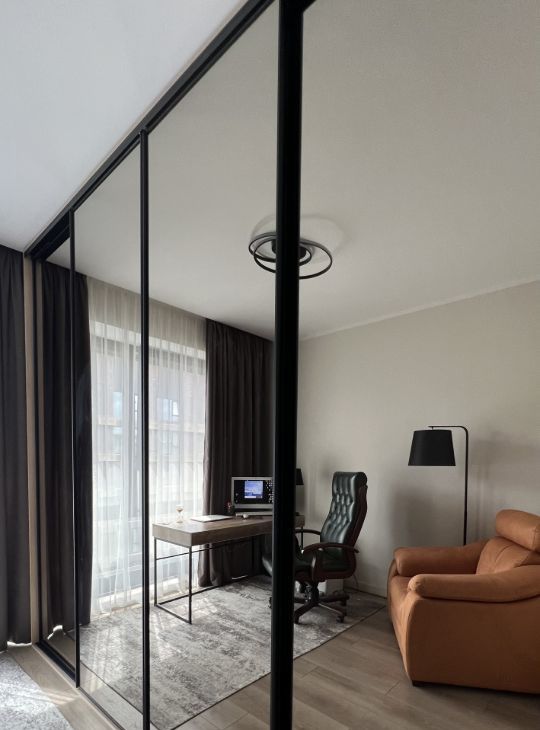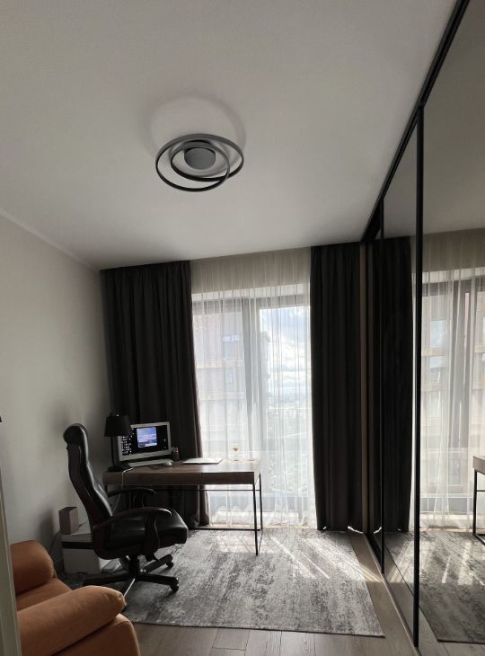 Рабочее место с удобным кабинетом и прекрасным видом на город — идеальный уголок для удалённой работы.