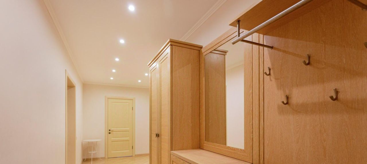 Необходимый набор мебели (как на фото) 2 шкафа в коридоре + одна из комнат оснащена как гардеробная. Кухонный гарнитур, посудомоечная машинка, духовой шкаф, микроволновка, варочная панель.