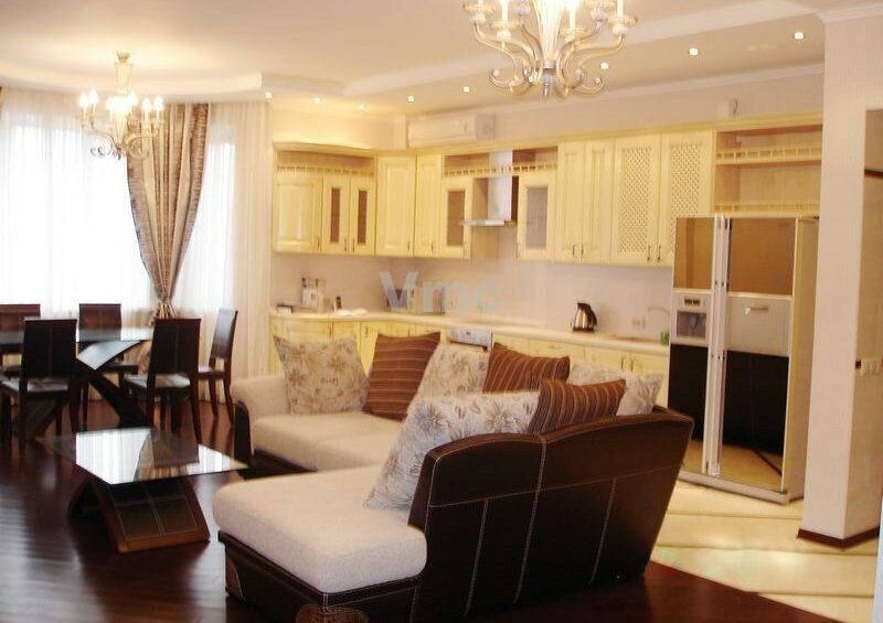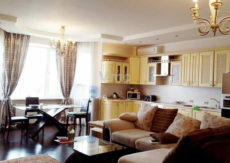 оборудована встроенным гарнитуром под единой столешницей со всей бытовой техникой: холодильник, варочная панель, вытяжка, духовой шкаф, посудомоечная машина и т.д. В квартире установлена сплит система кондиционеров. В подъезде дежурит консьерж. машиноместо в подземном паркинге.