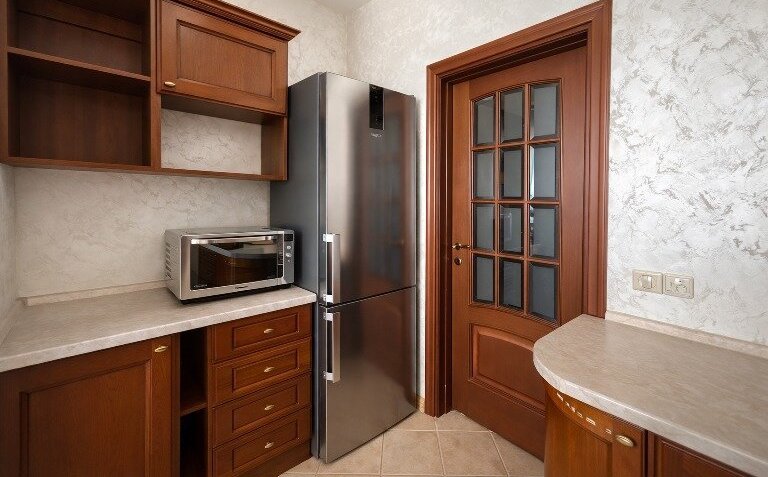 Кухня уже со встроенной техникой и удобными системами хранения.