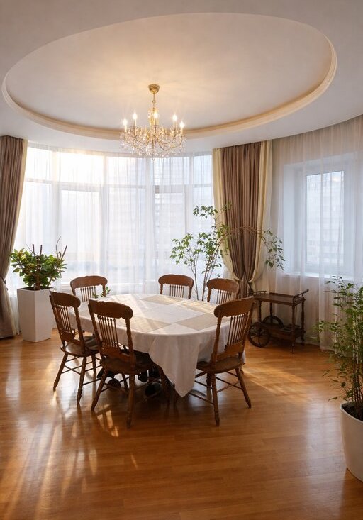 · Кухня-гостиная с эркером — светлая зона для ужинов и приёма гостей.