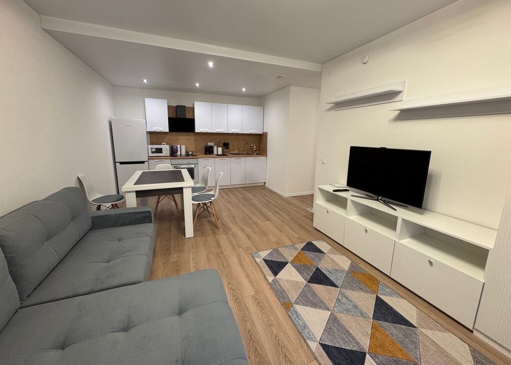 1) Готовая кухня с холодильником , плитой , свч , стол, стулья, диван раскладной, стенка, большой современный ТВ для времяпрепровождения.