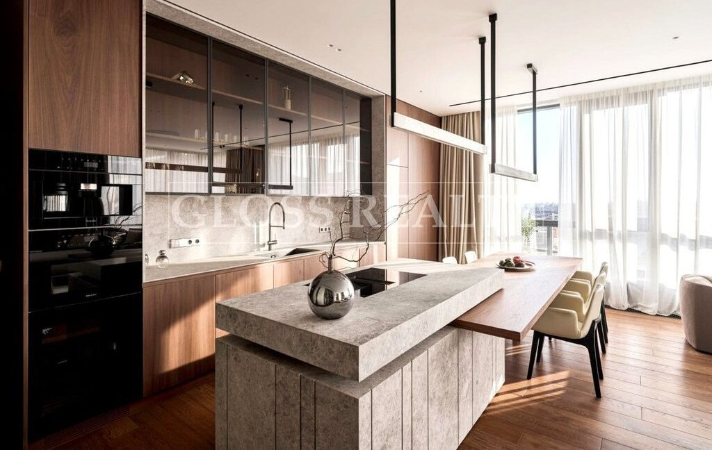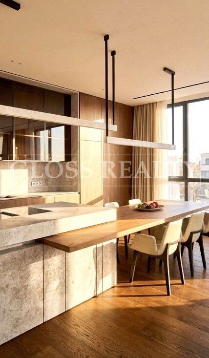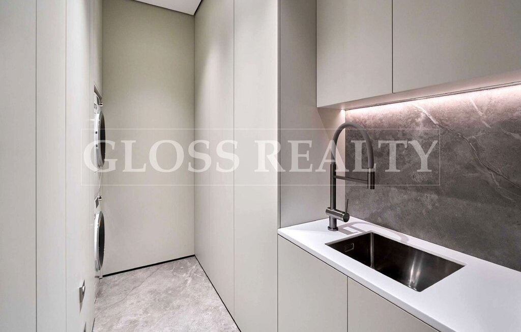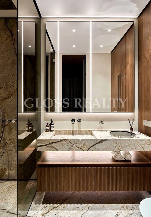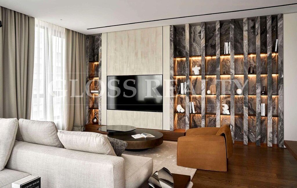Отделка выполнена из натуральных и высококачественных материалов - использованы мрамор, дубовый шпон, сатинированный металл и декоративные штукатурные покрытия.