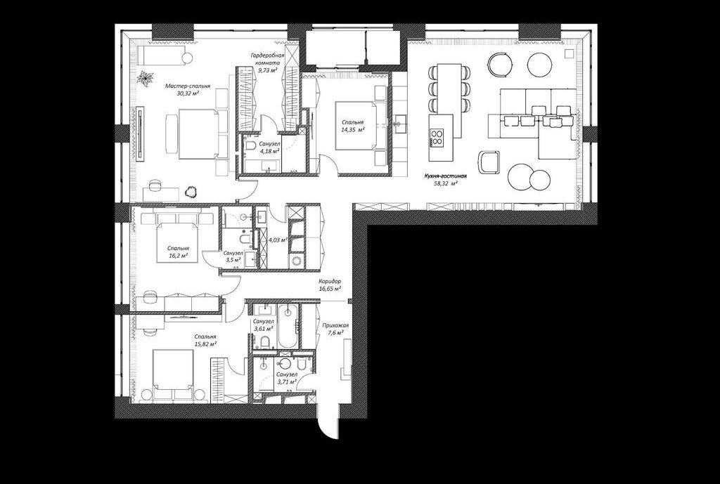 Главная спальня с собственной душевой комнатой и гардеробной - 45 м².