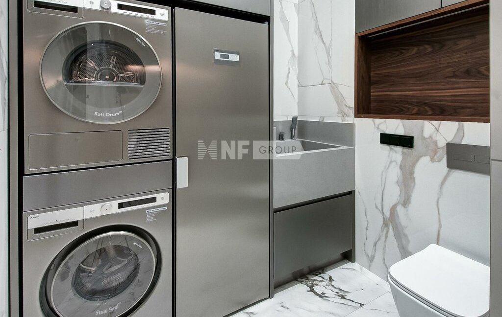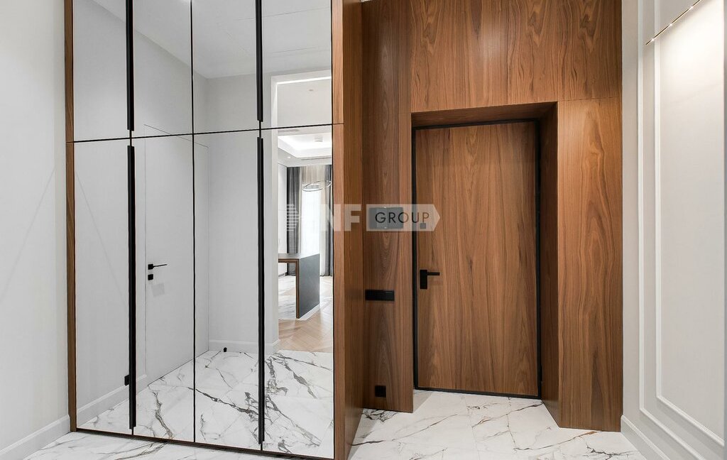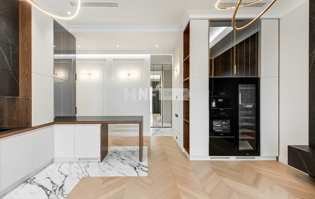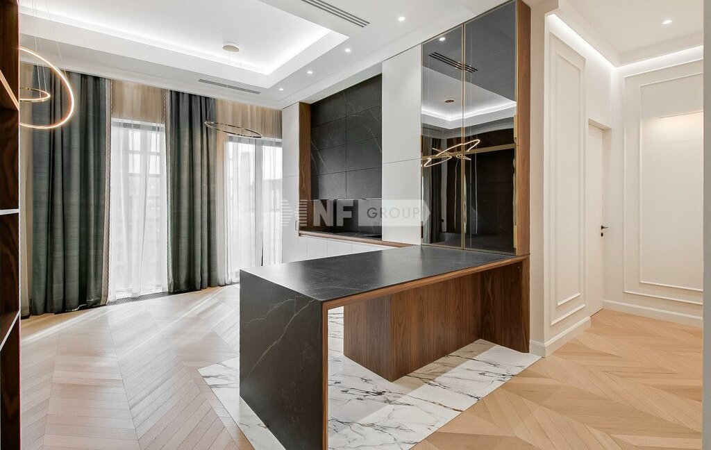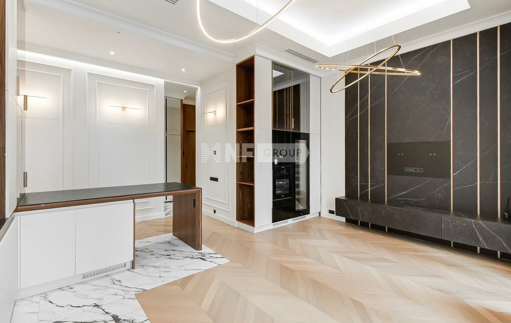 Интерьер выполнен в спокойной современной эстетике с акцентом на натуральные материалы, светлую палитру и четкую геометрию пространства. В отделке использованы дерево, натуральный камень и крупноформатный керамогранит. Также есть возможность индивидуальной установки встроенной кухни и мебели.