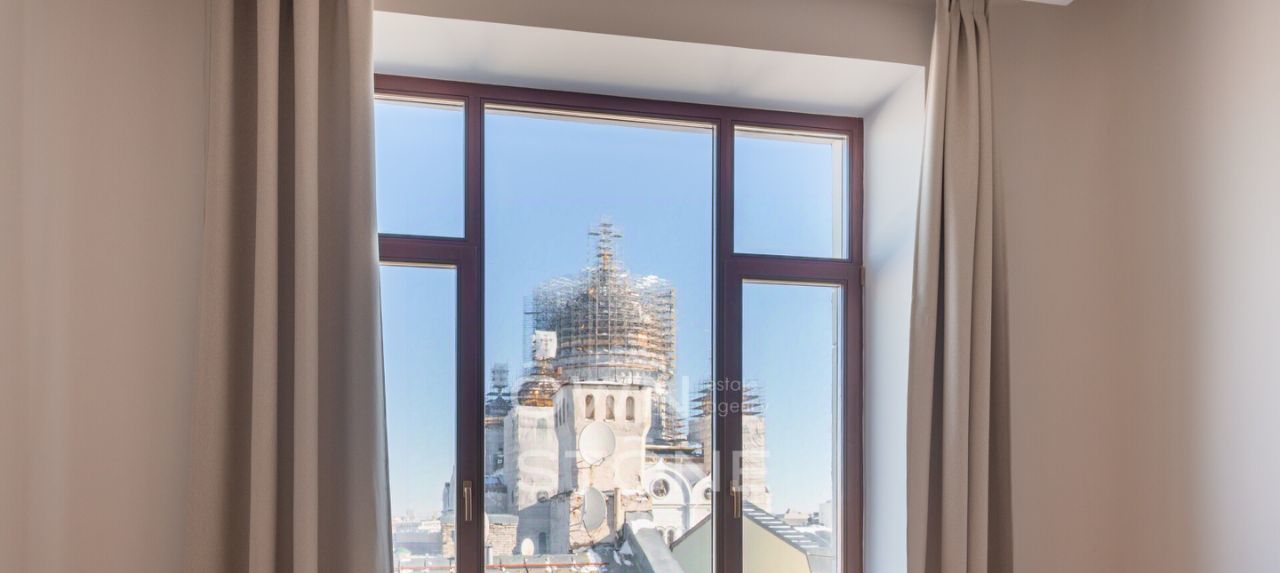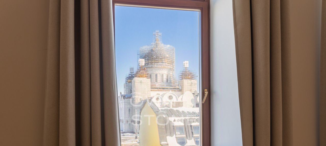 Локация: Центр Москвы, тихий переулок в шаговой доступности от Бульварного кольца. Из окон открывается захватывающий вид на Храм Христа Спасителя — редкая возможность для ценителей исторической атмосферы.
