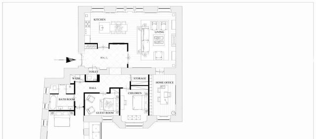 - Просторная гостиная объединённая с зоной кухни 70 м2;