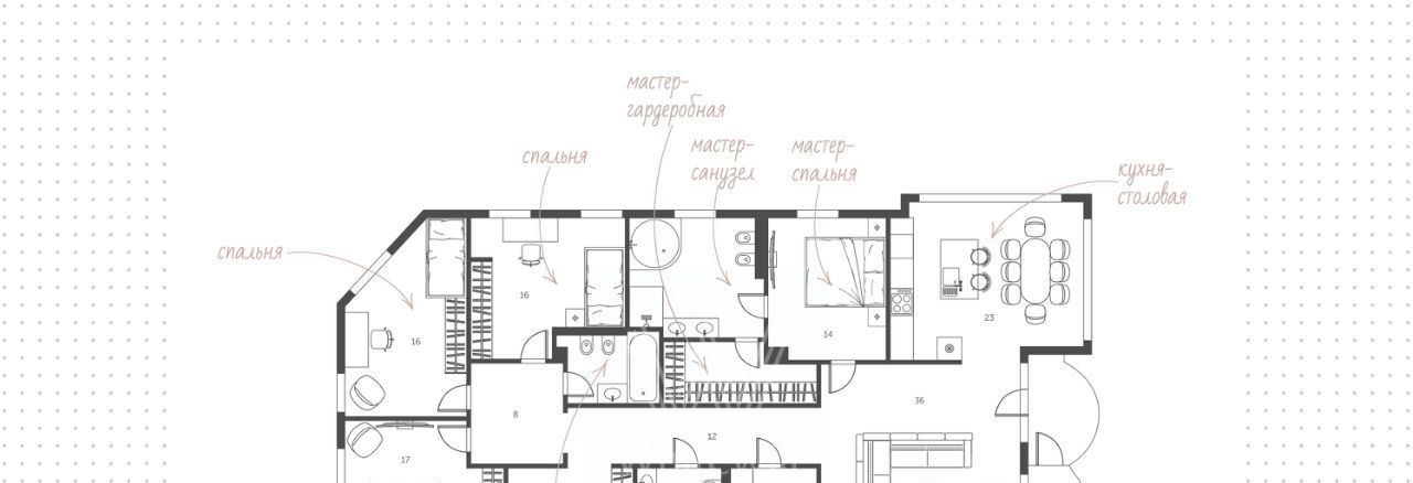Планировка включает гостиную, кухню-столовую с панорамными окнами, мастер-спальню со своей ванной комнатой и гардеробной, 3 спальни, два санузла, постирочную, балкон, лоджию и холл. Высота потолков 3 метра. Установлена система тёплый пол. Предусмотрено машино-место в подземном паркинге.