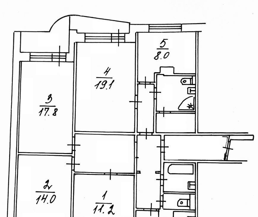 Жилые комнаты изолированные 19,1+8,0+17,8+14,0+11,2 кв.м., кухня 10,2 кв.м., 2 санузла (раздельный + совмещенный)