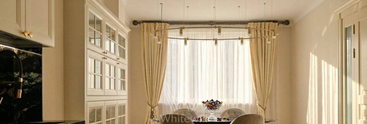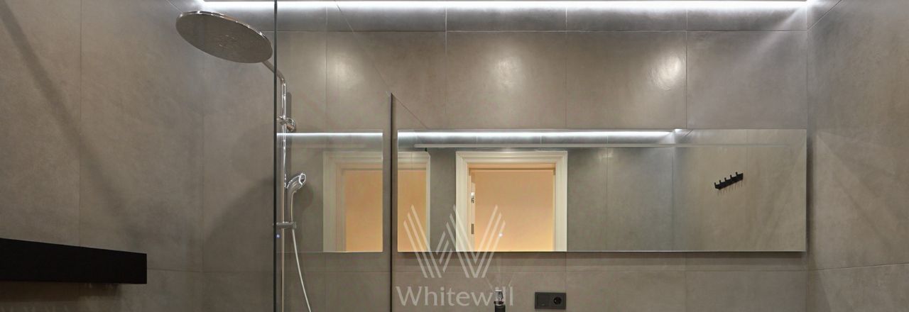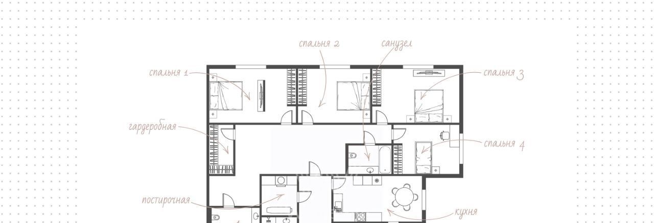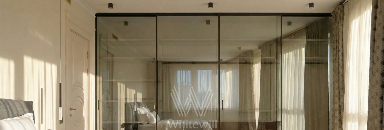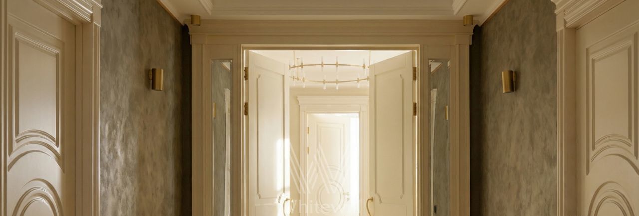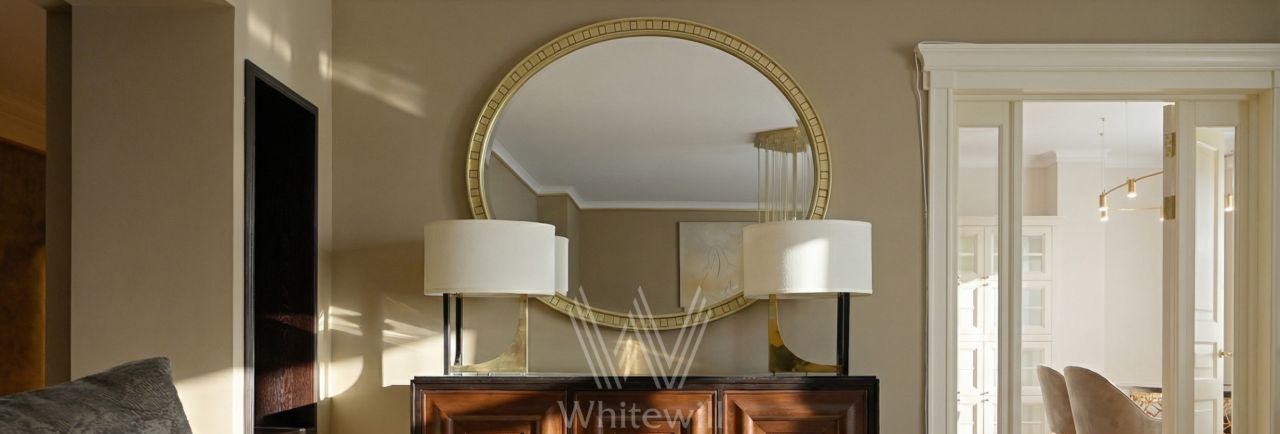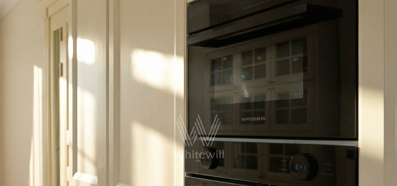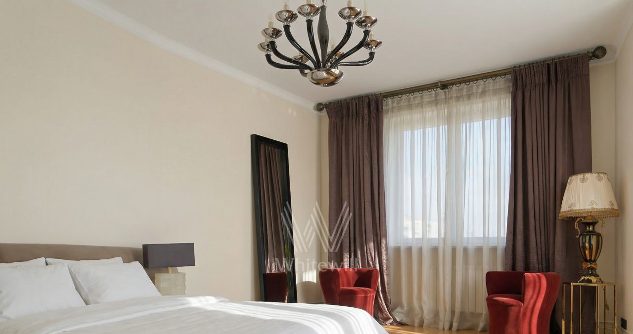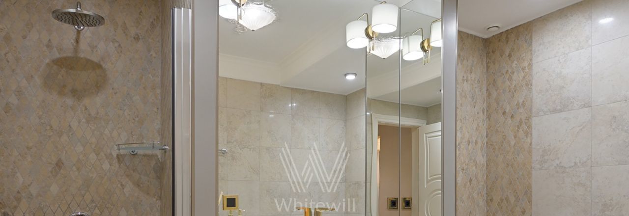 Планировка: гостиная, кухня, 4 спальни, 3 санузла, холл, постирочная, гардеробная, балкон. Высота потолков — 3 метра. Установлена посудомоечная, стиральная и сушильная машины, бойлер. Кондиционер и система подогрева полов позволяют поддерживать комфортную температуру. Одна из спален не меблирована, её можно оформить на свой вкус. Два машино-места в подземном паркинге входят в стоимость.
