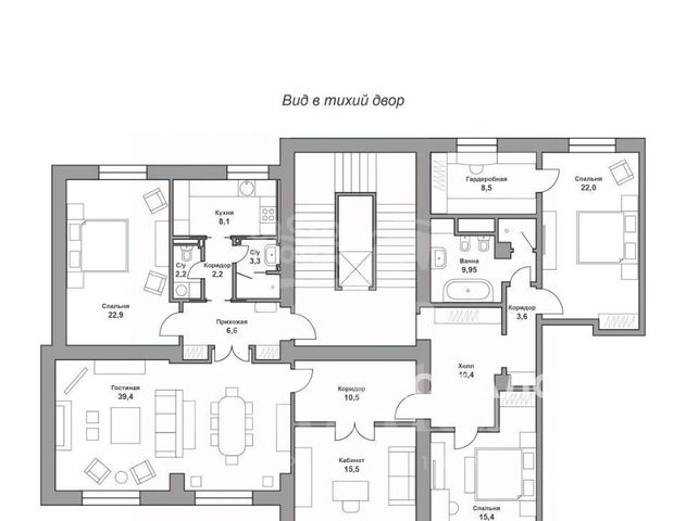Два балкона с видом во внутренний двор и на кроны деревьев обеспечивают тишину и возможность для медитации в самом центре города. Гардеробная с естественным светом становится символом порядка и заботы о себе. Квартира расположена целиком на этаже!