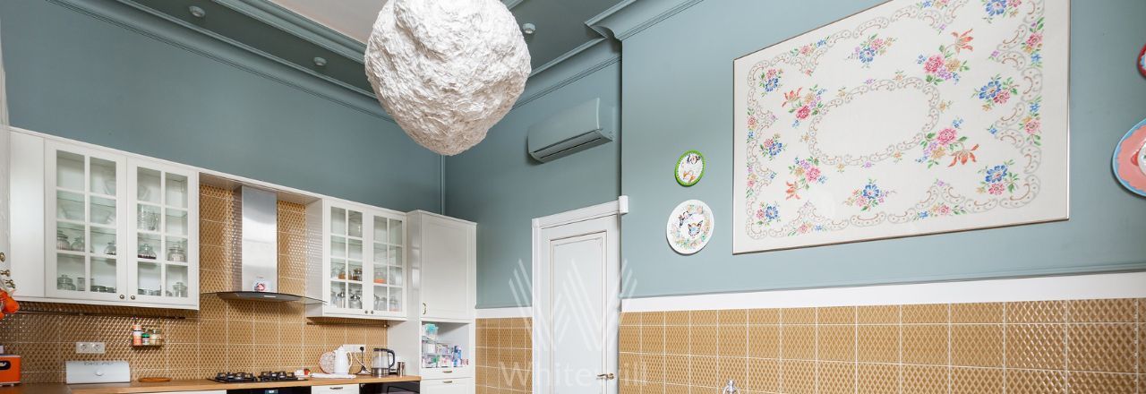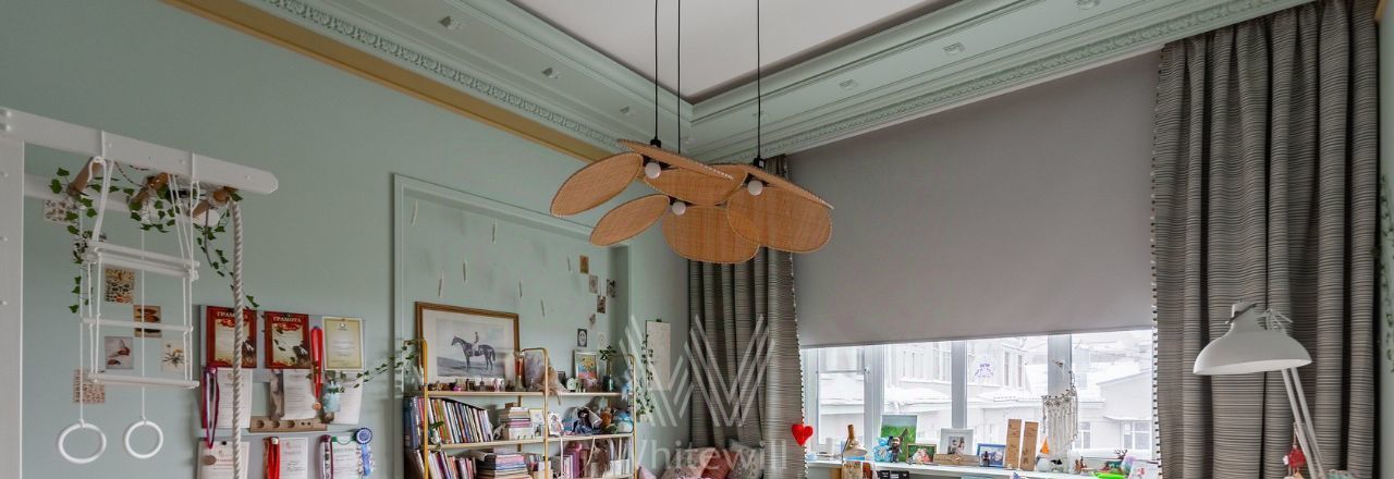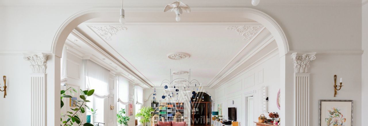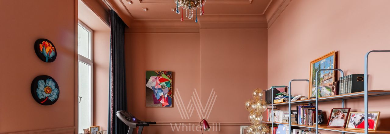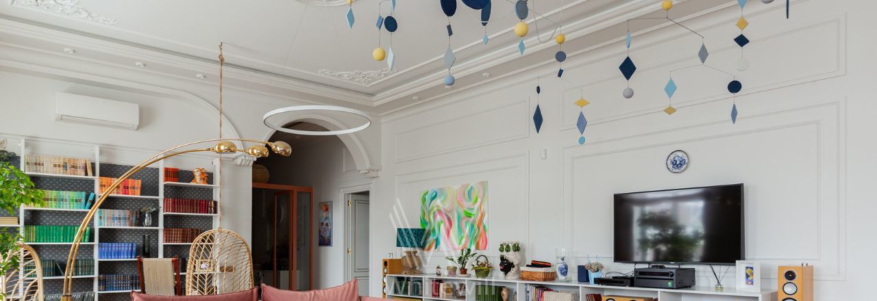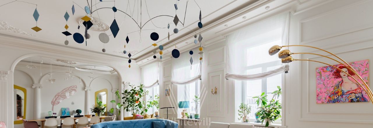 Бонус партнёрам 50%. Просторная квартира площадью 321 м² в особняке на Чистых прудах "Дом со львом" на 5 этаже. Выполнена дизайнерская отделка в авторском стиле. Стены оформлены молдингами, пилястрами и полуколоннами, потолок высотой 4 метра украшен лепниной и дизайнерскими подвесными светильниками. Светлый интерьер дополняют яркая мебель и предметы декора, установлен каминный портал. Большое количество окон наполняют пространство естественным светом.